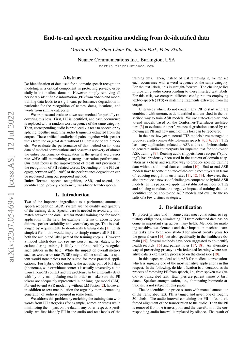 End-to-end speech recognition modeling from de-identified data