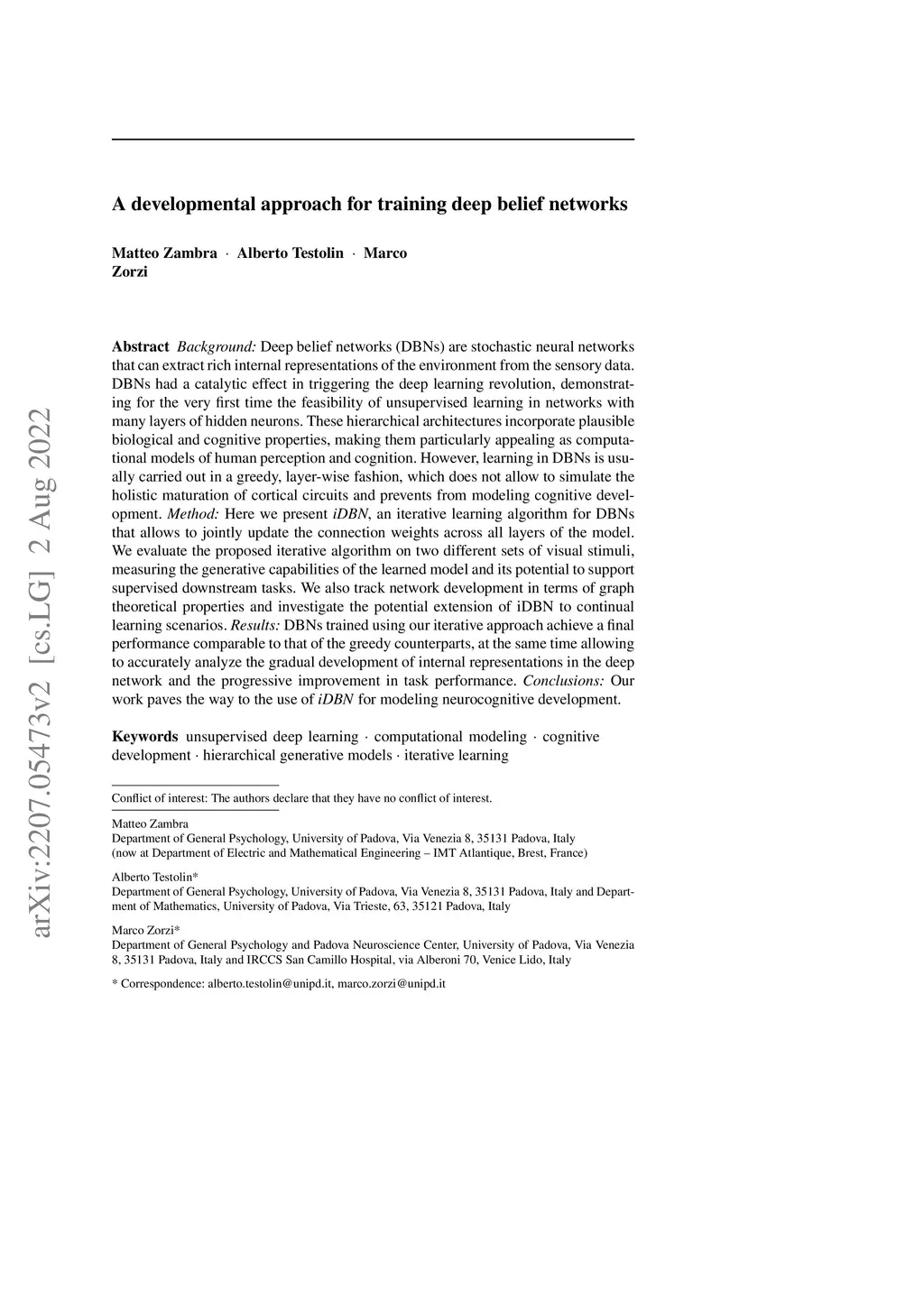 Deep belief networks (DBNs) are stochastic neural networks that can extract rich internal representations of the environment from the sensory data. DBNs had a catalytic effect in triggering the deep learning revolution, demonstrating for the very first time the feasibility of unsupervised learning in networks with many layers of hidden neurons. These hierarchical architectures incorporate plausible biological and cognitive properties, making them particularly appealing as computational models of human perception and cognition. However, learning in DBNs is usually carried out in a greedy, layer-wise fashion, which does not allow to simulate the holistic maturation of cortical circuits and prevents from modeling cognitive development. Here we present iDBN, an iterative learning algorithm for DBNs that allows to jointly update the connection weights across all layers of the model. We evaluate the proposed iterative algorithm on two different sets of visual stimuli, measuring the generative capabilities of the learned model and its potential to support supervised downstream tasks. We also track network development in terms of graph theoretical properties and investigate the potential extension of iDBN to continual learning scenarios. DBNs trained using our iterative approach achieve a final performance comparable to that of the greedy counterparts, at the same time allowing to accurately analyze the gradual development of internal representations in the deep network and the progressive improvement in task performance. Our work paves the way to the use of iDBN for modeling neurocognitive development.