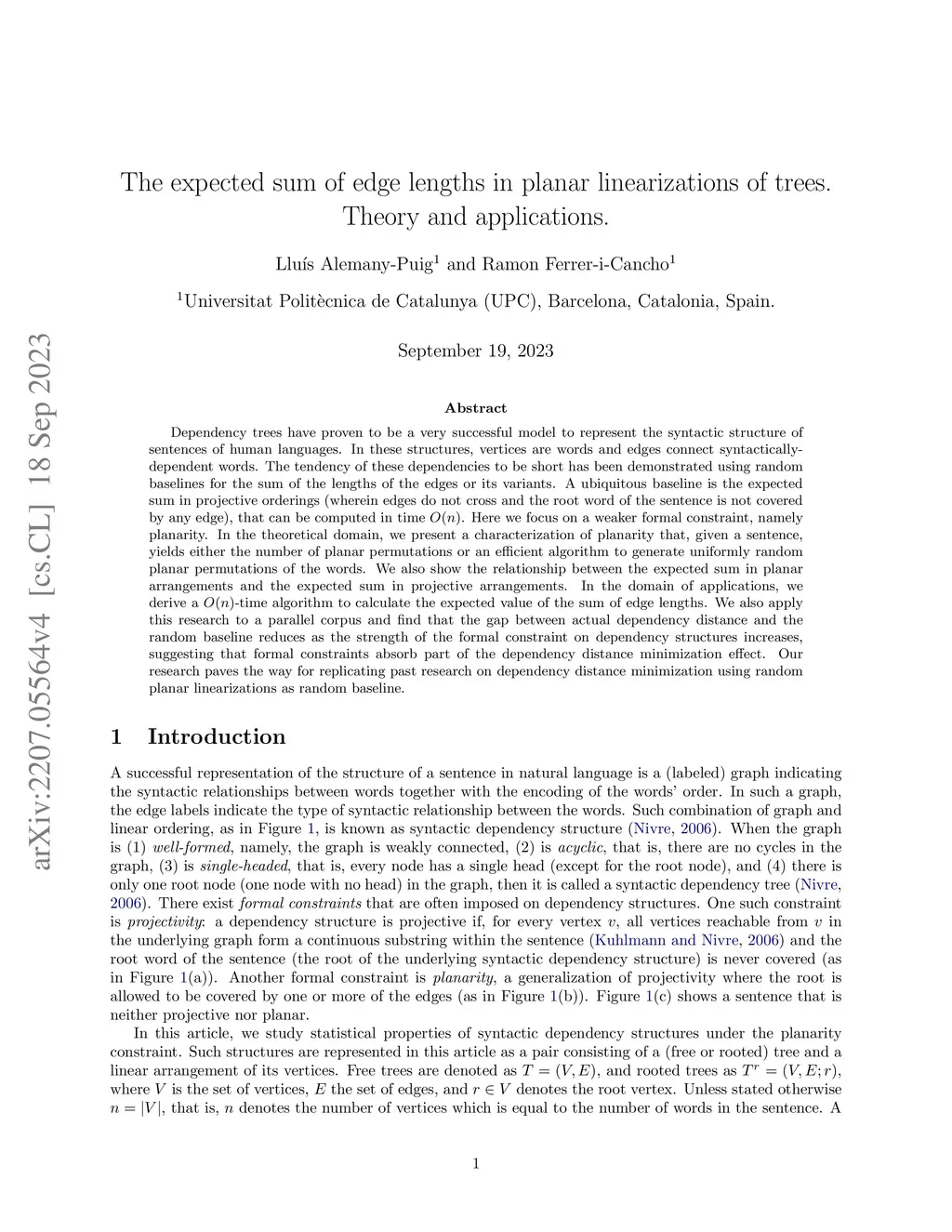 Dependency trees have proven to be a very successful model to represent the syntactic structure of sentences of human languages. In these structures, vertices are words and edges connect syntactically-dependent words. The tendency of these dependencies to be short has been demonstrated using random baselines for the sum of the lengths of the edges or its variants. A ubiquitous baseline is the expected sum in projective orderings (wherein edges do not cross and the root word of the sentence is not covered by any edge), that can be computed in time . Here we focus on a weaker formal constraint, namely planarity. In the theoretical domain, we present a characterization of planarity that, given a sentence, yields either the number of planar permutations or an efficient algorithm to generate uniformly random planar permutations of the words. We also show the relationship between the expected sum in planar arrangements and the expected sum in projective arrangements. In the domain of applications, we derive a -time algorithm to calculate the expected value of the sum of edge lengths. We also apply this research to a parallel corpus and find that the gap between actual dependency distance and the random baseline reduces as the strength of the formal constraint on dependency structures increases, suggesting that formal constraints absorb part of the dependency distance minimization effect. Our research paves the way for replicating past research on dependency distance minimization using random planar linearizations as random baseline.