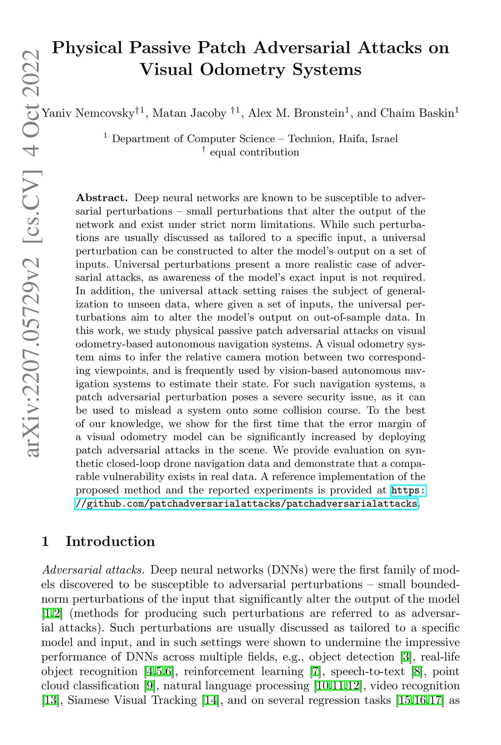 Physical Passive Patch Adversarial Attacks on Visual Odometry Systems