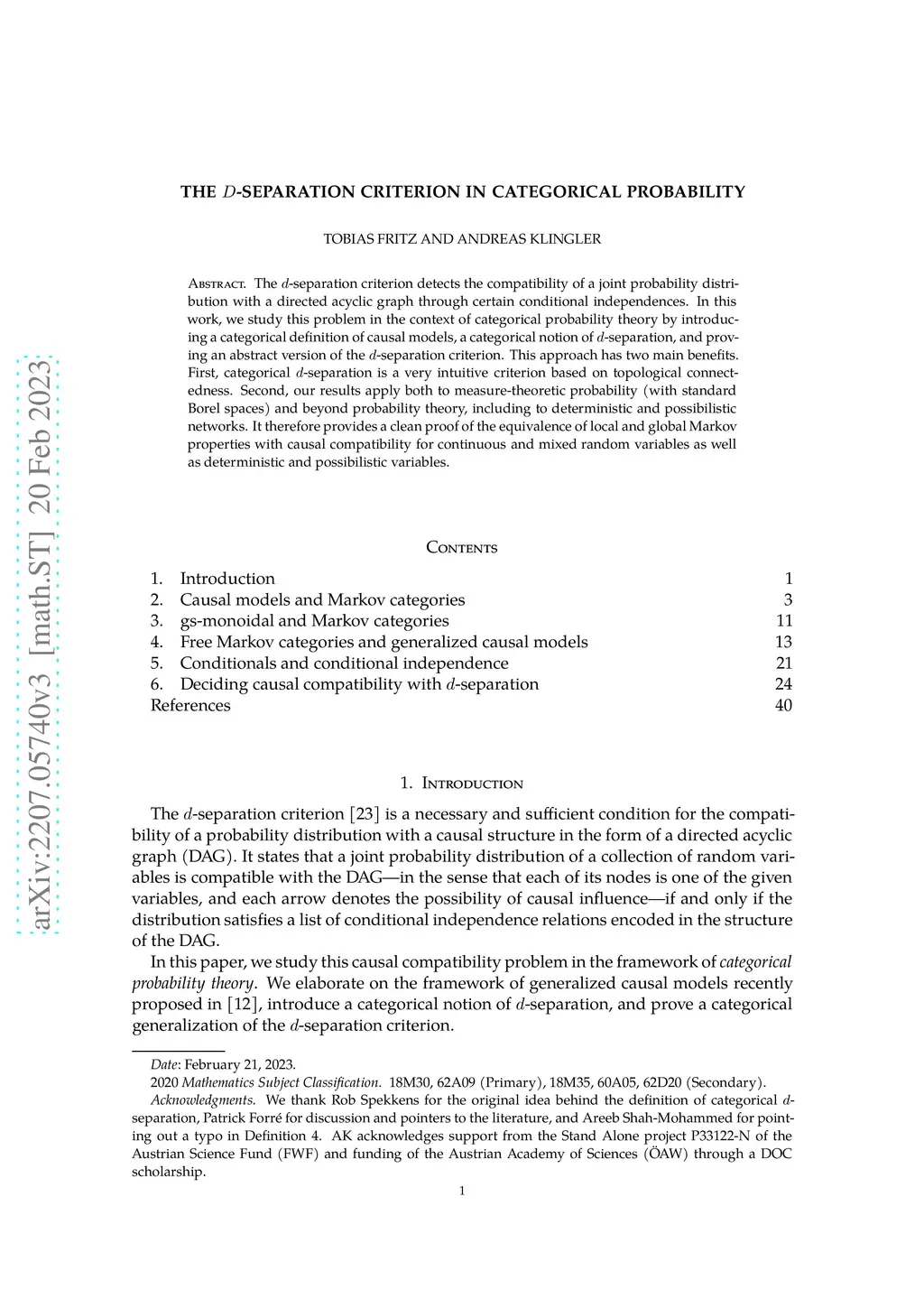 The d-separation criterion detects the compatibility of a joint probability distribution with a directed acyclic graph through certain conditional independences. In this work, we study this problem in the context of categorical probability theory by introducing a categorical definition of causal models, a categorical notion of d-separation, and proving an abstract version of the d-separation criterion. This approach has two main benefits. First, categorical d-separation is a very intuitive criterion based on topological connectedness. Second, our results apply both to measure-theoretic probability (with standard Borel spaces) and beyond probability theory, including to deterministic and possibilistic networks. It therefore provides a clean proof of the equivalence of local and global Markov properties with causal compatibility for continuous and mixed random variables as well as deterministic and possibilistic variables.