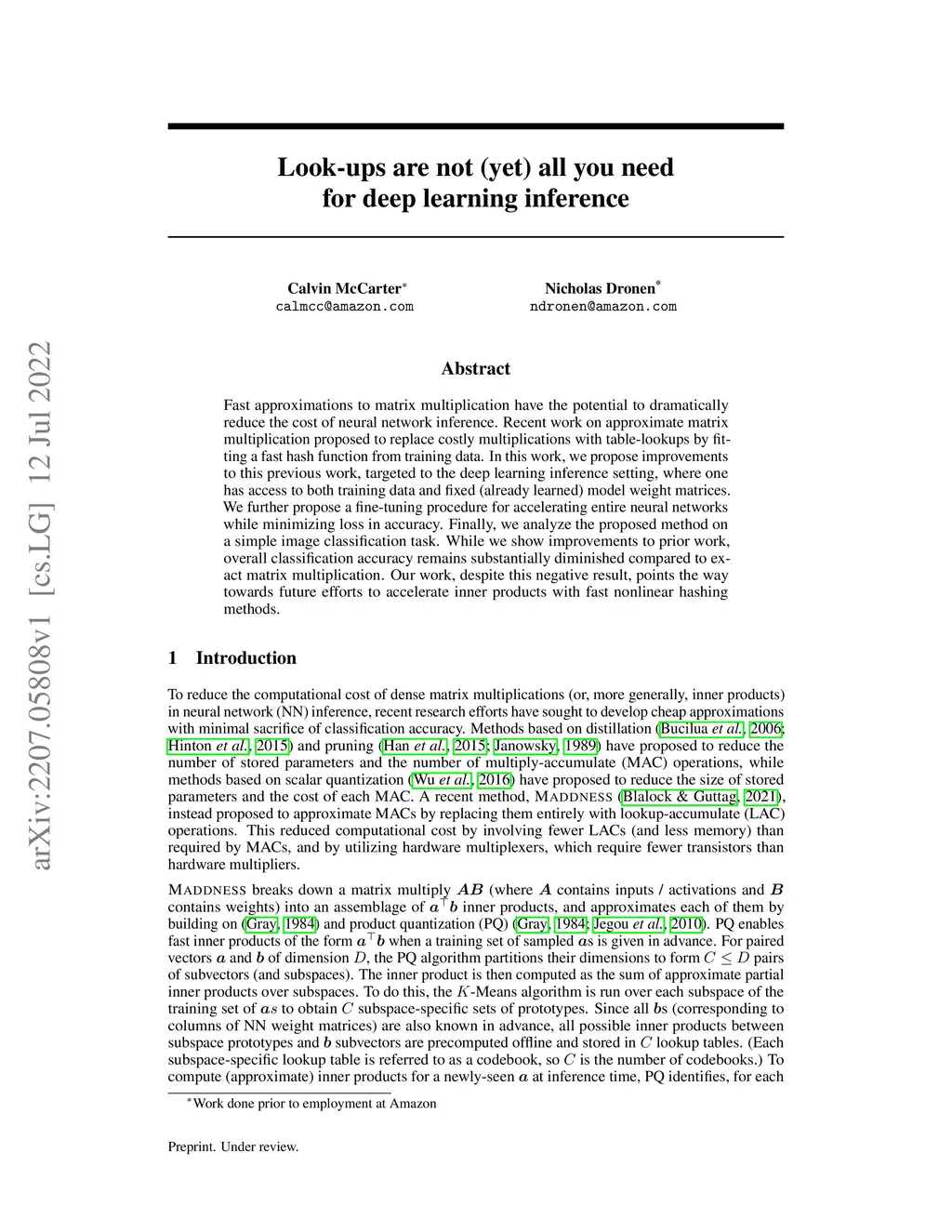 Fast approximations to matrix multiplication have the potential to dramatically reduce the cost of neural network inference. Recent work on approximate matrix multiplication proposed to replace costly multiplications with table-lookups by fitting a fast hash function from training data. In this work, we propose improvements to this previous work, targeted to the deep learning inference setting, where one has access to both training data and fixed (already learned) model weight matrices. We further propose a fine-tuning procedure for accelerating entire neural networks while minimizing loss in accuracy. Finally, we analyze the proposed method on a simple image classification task. While we show improvements to prior work, overall classification accuracy remains substantially diminished compared to exact matrix multiplication. Our work, despite this negative result, points the way towards future efforts to accelerate inner products with fast nonlinear hashing methods.