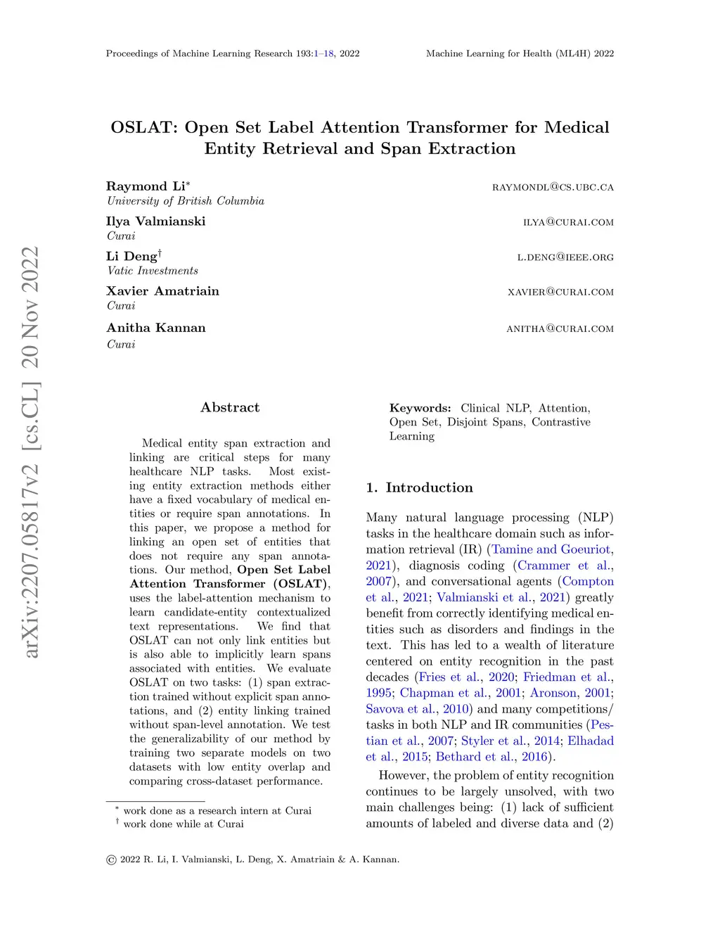 Medical entity span extraction and linking are critical steps for many healthcare NLP tasks. Most existing entity extraction methods either have a fixed vocabulary of medical entities or require span annotations. In this paper, we propose a method for linking an open set of entities that does not require any span annotations. Our method, Open Set Label Attention Transformer (OSLAT), uses the label-attention mechanism to learn candidate-entity contextualized text representations. We find that OSLAT can not only link entities but is also able to implicitly learn spans associated with entities. We evaluate OSLAT on two tasks: (1) span extraction trained without explicit span annotations, and (2) entity linking trained without span-level annotation. We test the generalizability of our method by training two separate models on two datasets with low entity overlap and comparing cross-dataset performance.
