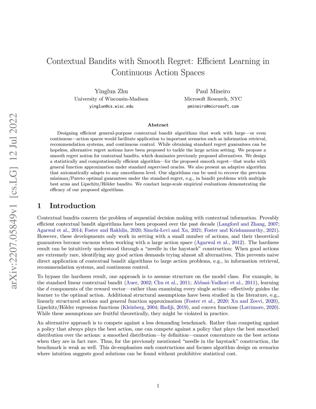 Contextual Bandits with Smooth Regret: Efficient Learning in Continuous
