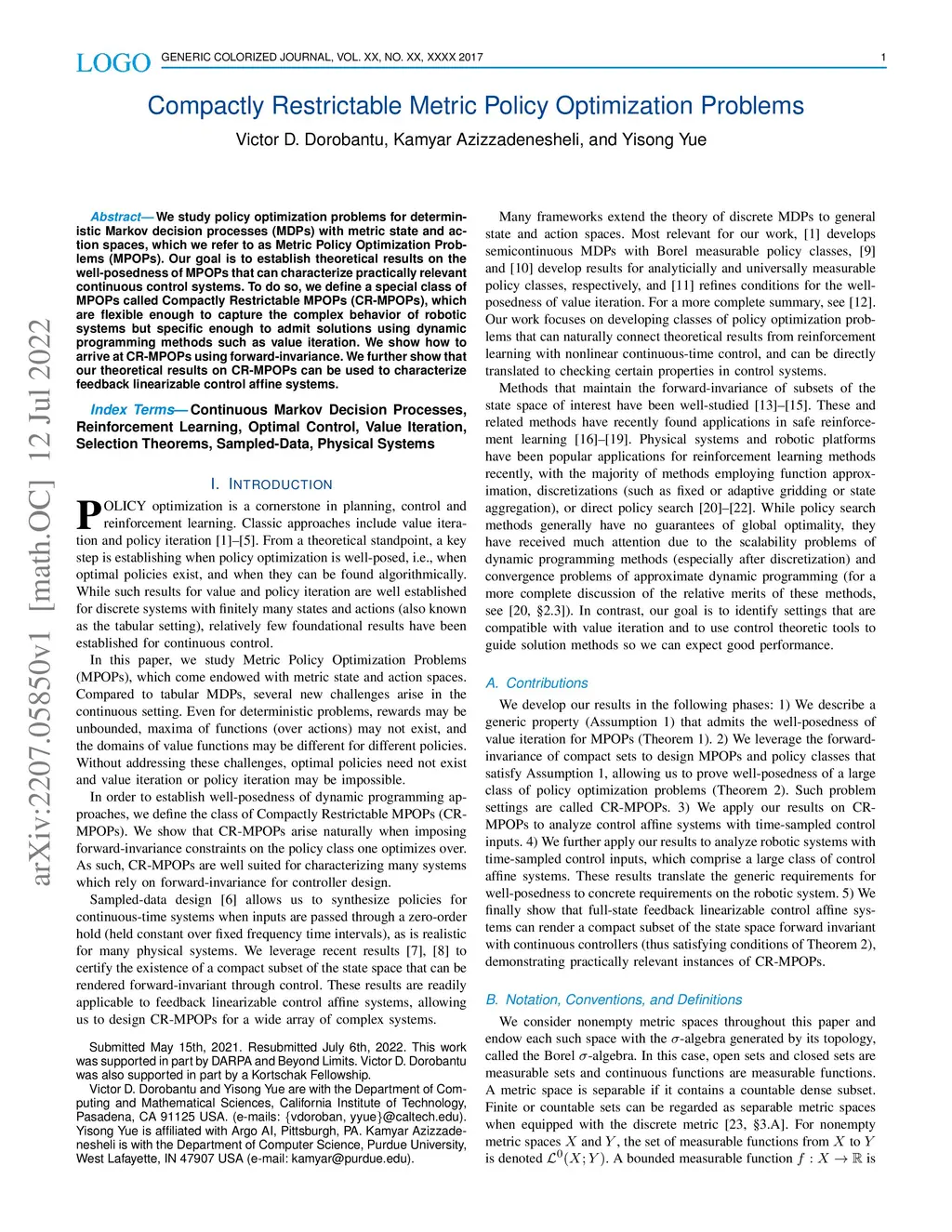 We study policy optimization problems for deterministic Markov decision processes (MDPs) with metric state and action spaces, which we refer to as Metric Policy Optimization Problems (MPOPs). Our goal is to establish theoretical results on the well-posedness of MPOPs that can characterize practically relevant continuous control systems. To do so, we define a special class of MPOPs called Compactly Restrictable MPOPs (CR-MPOPs), which are flexible enough to capture the complex behavior of robotic systems but specific enough to admit solutions using dynamic programming methods such as value iteration. We show how to arrive at CR-MPOPs using forward-invariance. We further show that our theoretical results on CR-MPOPs can be used to characterize feedback linearizable control affine systems.