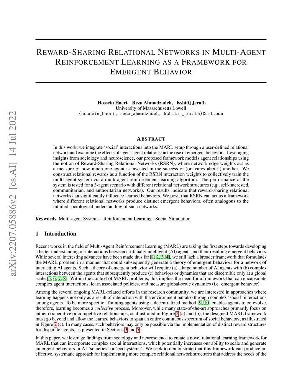 In this work, we integrate `social' interactions into the MARL setup through a user-defined relational network and examine the effects of agent-agent relations on the rise of emergent behaviors. Leveraging insights from sociology and neuroscience, our proposed framework models agent relationships using the notion of Reward-Sharing Relational Networks (RSRN), where network edge weights act as a measure of how much one agent is invested in the success of (or `cares about') another. We construct relational rewards as a function of the RSRN interaction weights to collectively train the multi-agent system via a multi-agent reinforcement learning algorithm. The performance of the system is tested for a 3-agent scenario with different relational network structures (e.g., self-interested, communitarian, and authoritarian networks). Our results indicate that reward-sharing relational networks can significantly influence learned behaviors. We posit that RSRN can act as a framework where different relational networks produce distinct emergent behaviors, often analogous to the intuited sociological understanding of such networks.