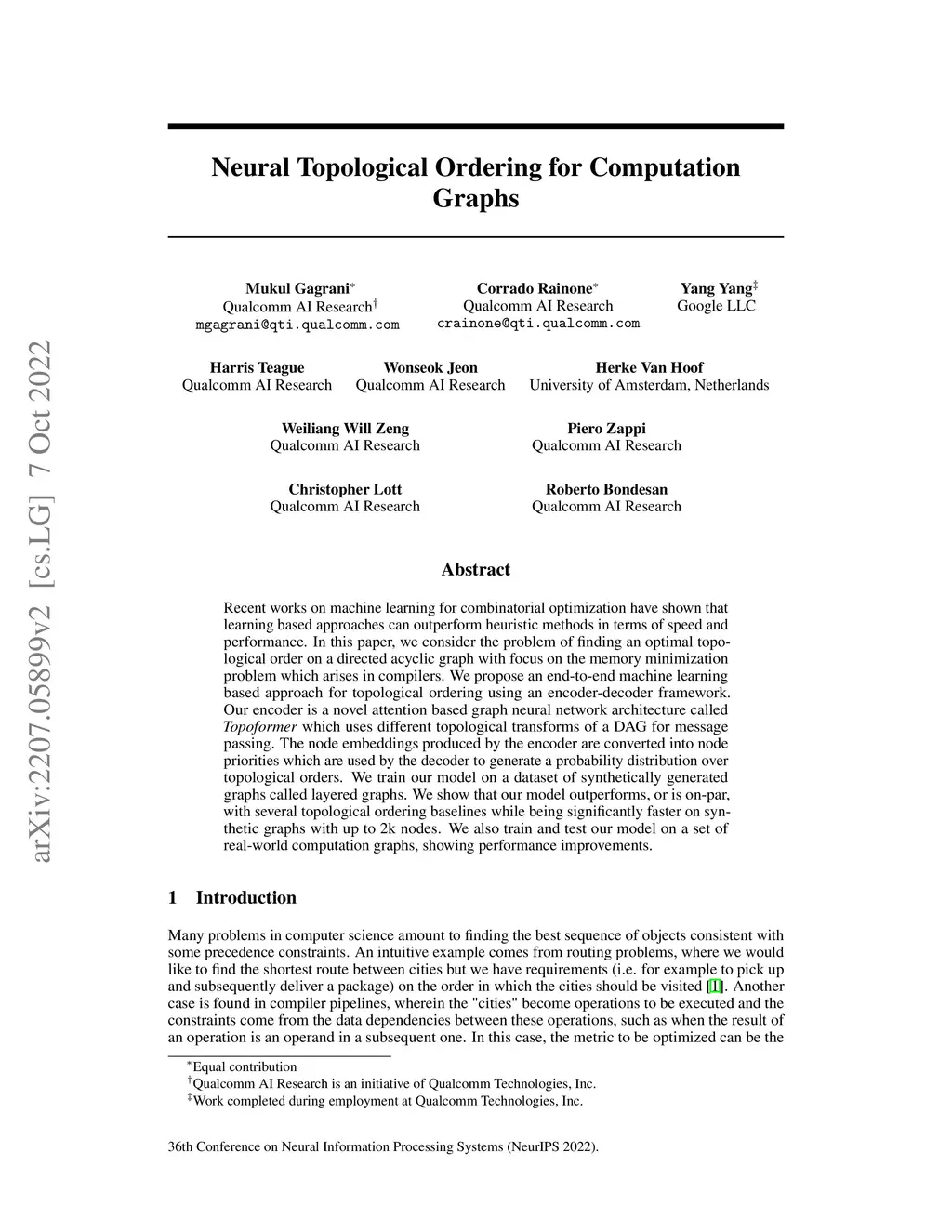 Recent works on machine learning for combinatorial optimization have shown that learning based approaches can outperform heuristic methods in terms of speed and performance. In this paper, we consider the problem of finding an optimal topological order on a directed acyclic graph with focus on the memory minimization problem which arises in compilers. We propose an end-to-end machine learning based approach for topological ordering using an encoder-decoder framework. Our encoder is a novel attention based graph neural network architecture called \emph{Topoformer} which uses different topological transforms of a DAG for message passing. The node embeddings produced by the encoder are converted into node priorities which are used by the decoder to generate a probability distribution over topological orders. We train our model on a dataset of synthetically generated graphs called layered graphs. We show that our model outperforms, or is on-par, with several topological ordering baselines while being significantly faster on synthetic graphs with up to 2k nodes. We also train and test our model on a set of real-world computation graphs, showing performance improvements.