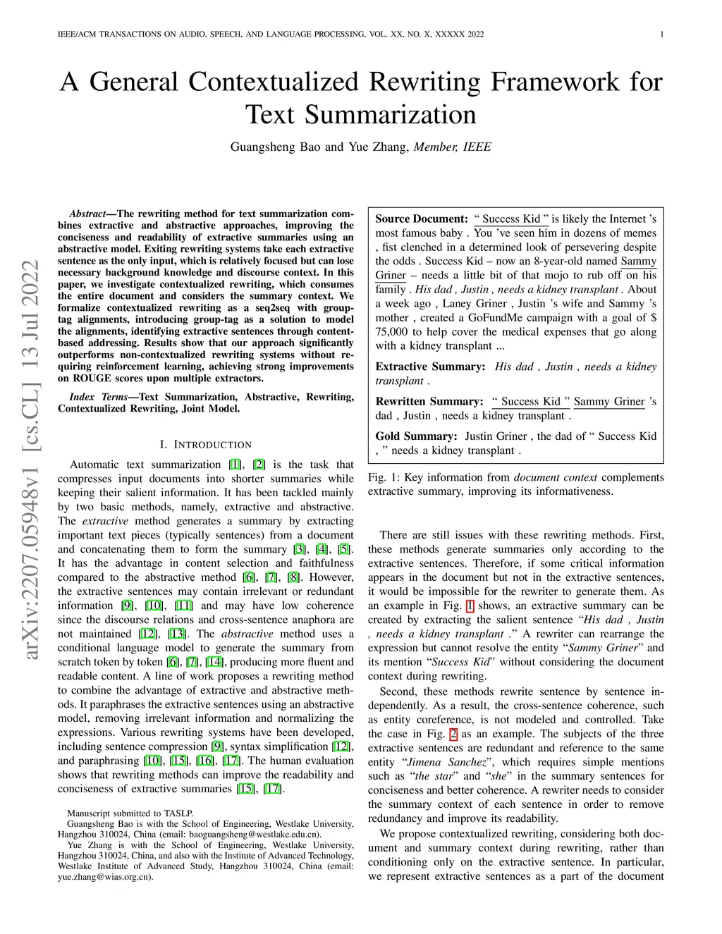 The rewriting method for text summarization combines extractive and abstractive approaches, improving the conciseness and readability of extractive summaries using an abstractive model. Exiting rewriting systems take each extractive sentence as the only input, which is relatively focused but can lose necessary background knowledge and discourse context. In this paper, we investigate contextualized rewriting, which consumes the entire document and considers the summary context. We formalize contextualized rewriting as a seq2seq with group-tag alignments, introducing group-tag as a solution to model the alignments, identifying extractive sentences through content-based addressing. Results show that our approach significantly outperforms non-contextualized rewriting systems without requiring reinforcement learning, achieving strong improvements on ROUGE scores upon multiple extractors.