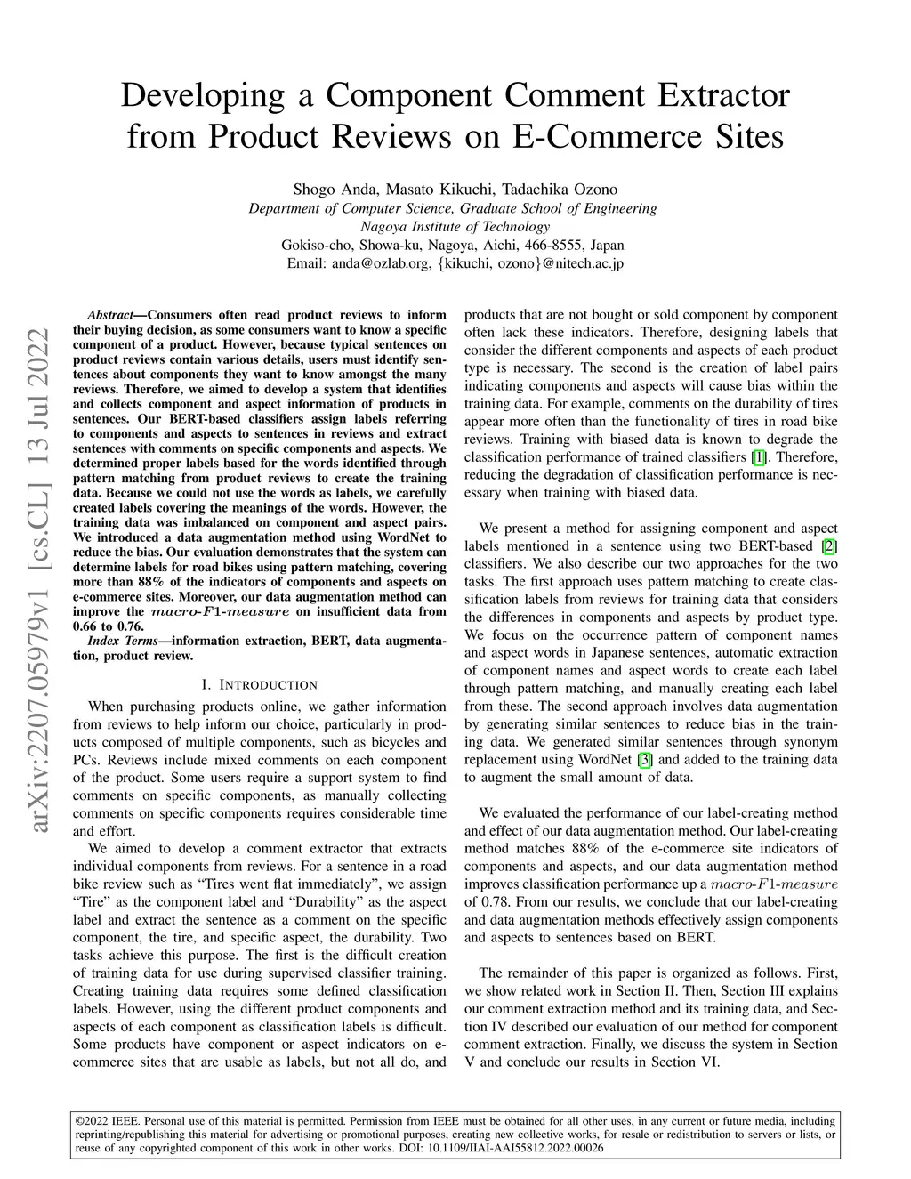 Consumers often read product reviews to inform their buying decision, as some consumers want to know a specific component of a product. However, because typical sentences on product reviews contain various details, users must identify sentences about components they want to know amongst the many reviews. Therefore, we aimed to develop a system that identifies and collects component and aspect information of products in sentences. Our BERT-based classifiers assign labels referring to components and aspects to sentences in reviews and extract sentences with comments on specific components and aspects. We determined proper labels based for the words identified through pattern matching from product reviews to create the training data. Because we could not use the words as labels, we carefully created labels covering the meanings of the words. However, the training data was imbalanced on component and aspect pairs. We introduced a data augmentation method using WordNet to reduce the bias. Our evaluation demonstrates that the system can determine labels for road bikes using pattern matching, covering more than 88\% of the indicators of components and aspects on e-commerce sites. Moreover, our data augmentation method can improve the-F1-measure on insufficient data from 0.66 to 0.76.