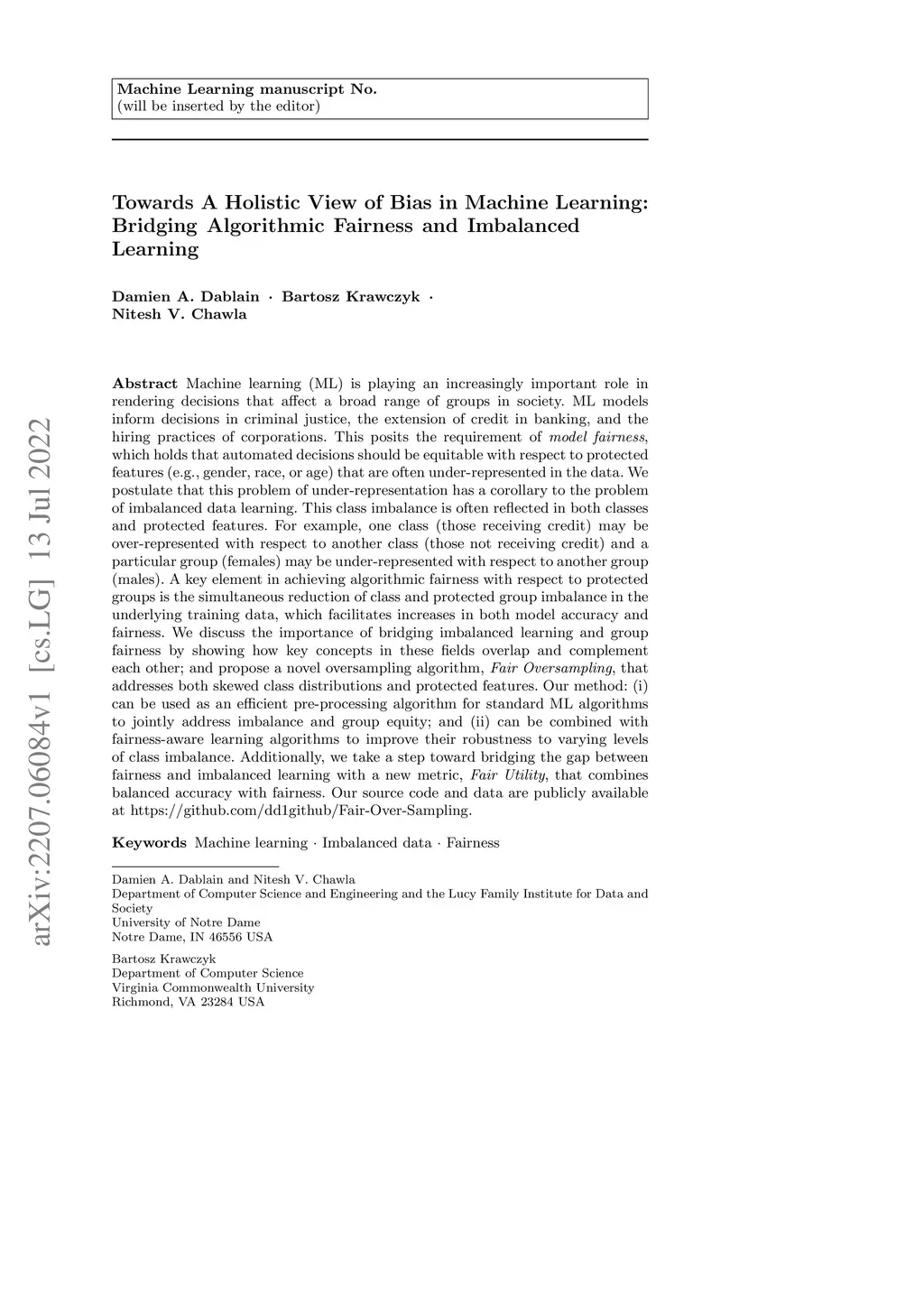 Machine learning (ML) is playing an increasingly important role in rendering decisions that affect a broad range of groups in society. ML models inform decisions in criminal justice, the extension of credit in banking, and the hiring practices of corporations. This posits the requirement of model fairness, which holds that automated decisions should be equitable with respect to protected features (e.g., gender, race, or age) that are often under-represented in the data. We postulate that this problem of under-representation has a corollary to the problem of imbalanced data learning. This class imbalance is often reflected in both classes and protected features. For example, one class (those receiving credit) may be over-represented with respect to another class (those not receiving credit) and a particular group (females) may be under-represented with respect to another group (males). A key element in achieving algorithmic fairness with respect to protected groups is the simultaneous reduction of class and protected group imbalance in the underlying training data, which facilitates increases in both model accuracy and fairness. We discuss the importance of bridging imbalanced learning and group fairness by showing how key concepts in these fields overlap and complement each other; and propose a novel oversampling algorithm, Fair Oversampling, that addresses both skewed class distributions and protected features. Our method: (i) can be used as an efficient pre-processing algorithm for standard ML algorithms to jointly address imbalance and group equity; and (ii) can be combined with fairness-aware learning algorithms to improve their robustness to varying levels of class imbalance. Additionally, we take a step toward bridging the gap between fairness and imbalanced learning with a new metric, Fair Utility, that combines balanced accuracy with fairness.