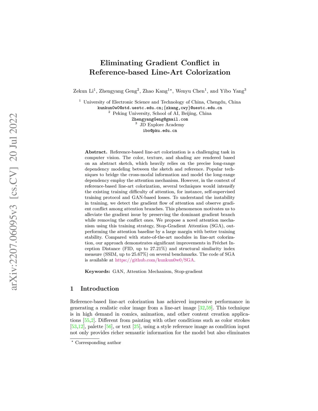 Reference-based line-art colorization is a challenging task in computer vision. The color, texture, and shading are rendered based on an abstract sketch, which heavily relies on the precise long-range dependency modeling between the sketch and reference. Popular techniques to bridge the cross-modal information and model the long-range dependency employ the attention mechanism. However, in the context of reference-based line-art colorization, several techniques would intensify the existing training difficulty of attention, for instance, self-supervised training protocol and GAN-based losses. To understand the instability in training, we detect the gradient flow of attention and observe gradient conflict among attention branches. This phenomenon motivates us to alleviate the gradient issue by preserving the dominant gradient branch while removing the conflict ones. We propose a novel attention mechanism using this training strategy, Stop-Gradient Attention (SGA), outperforming the attention baseline by a large margin with better training stability. Compared with state-of-the-art modules in line-art colorization, our approach demonstrates significant improvements in Fr\échet Inception Distance (FID, up to 27.21%) and structural similarity index measure (SSIM, up to 25.67%) on several benchmarks. The code of SGA is available at https://github.com/kunkun0w0/SGA .