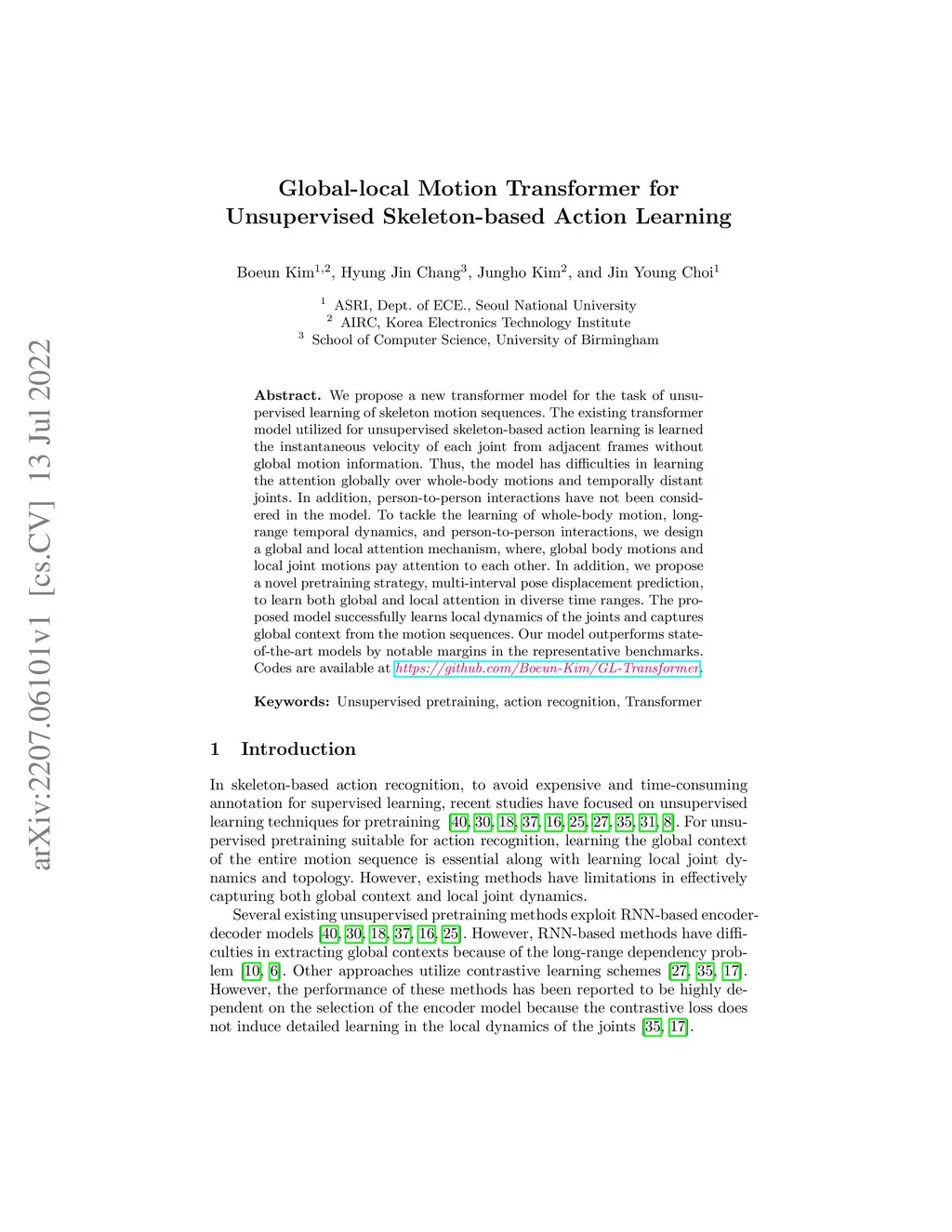 Global-local Motion Transformer for Unsupervised Skeleton-based Action