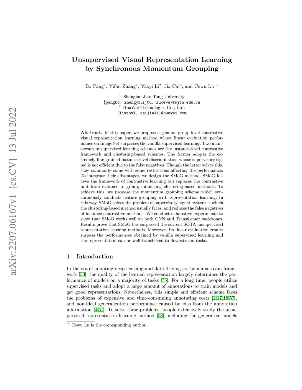 In this paper, we propose a genuine group-level contrastive visual representation learning method whose linear evaluation performance on ImageNet surpasses the vanilla supervised learning. Two mainstream unsupervised learning schemes are the instance-level contrastive framework and clustering-based schemes. The former adopts the extremely fine-grained instance-level discrimination whose supervisory signal is not efficient due to the false negatives. Though the latter solves this, they commonly come with some restrictions affecting the performance. To integrate their advantages, we design the SMoG method. SMoG follows the framework of contrastive learning but replaces the contrastive unit from instance to group, mimicking clustering-based methods. To achieve this, we propose the momentum grouping scheme which synchronously conducts feature grouping with representation learning. In this way, SMoG solves the problem of supervisory signal hysteresis which the clustering-based method usually faces, and reduces the false negatives of instance contrastive methods. We conduct exhaustive experiments to show that SMoG works well on both CNN and Transformer backbones. Results prove that SMoG has surpassed the current SOTA unsupervised representation learning methods. Moreover, its linear evaluation results surpass the performances obtained by vanilla supervised learning and the representation can be well transferred to downstream tasks.