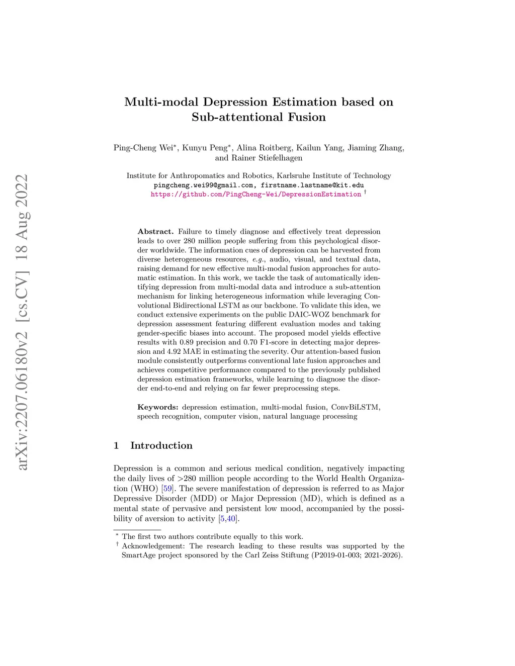 Failure to timely diagnose and effectively treat depression leads to over 280 million people suffering from this psychological disorder worldwide. The information cues of depression can be harvested from diverse heterogeneous resources, e.g., audio, visual, and textual data, raising demand for new effective multi-modal fusion approaches for automatic estimation. In this work, we tackle the task of automatically identifying depression from multi-modal data and introduce a sub-attention mechanism for linking heterogeneous information while leveraging Convolutional Bidirectional LSTM as our backbone. To validate this idea, we conduct extensive experiments on the public DAIC-WOZ benchmark for depression assessment featuring different evaluation modes and taking gender-specific biases into account. The proposed model yields effective results with 0.89 precision and 0.70 F1-score in detecting major depression and 4.92 MAE in estimating the severity. Our attention-based fusion module consistently outperforms conventional late fusion approaches and achieves competitive performance compared to the previously published depression estimation frameworks, while learning to diagnose the disorder end-to-end and relying on far fewer preprocessing steps.