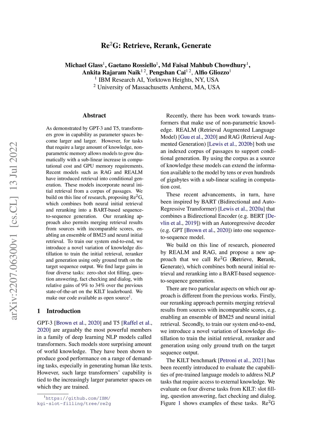 As demonstrated by GPT-3 and T5, transformers grow in capability as parameter spaces become larger and larger. However, for tasks that require a large amount of knowledge, non-parametric memory allows models to grow dramatically with a sub-linear increase in computational cost and GPU memory requirements. Recent models such as RAG and REALM have introduced retrieval into conditional generation. These models incorporate neural initial retrieval from a corpus of passages. We build on this line of research, proposing Re2G, which combines both neural initial retrieval and reranking into a BART-based sequence-to-sequence generation. Our reranking approach also permits merging retrieval results from sources with incomparable scores, enabling an ensemble of BM25 and neural initial retrieval. To train our system end-to-end, we introduce a novel variation of knowledge distillation to train the initial retrieval, reranker, and generation using only ground truth on the target sequence output. We find large gains in four diverse tasks: zero-shot slot filling, question answering, fact-checking, and dialog, with relative gains of 9% to 34% over the previous state-of-the-art on the KILT leaderboard. We make our code available as open source at https://github.com/IBM/kgi-slot-filling/tree/re2g.
