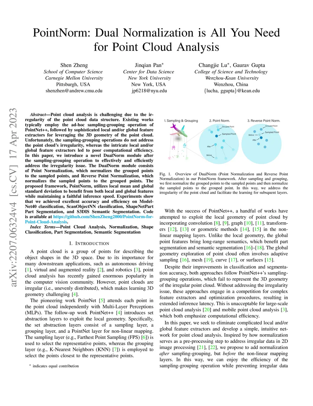 Point cloud analysis is challenging due to the irregularity of the point cloud data structure. Existing works typically employ the ad-hoc sampling-grouping operation of PointNet++, followed by sophisticated local and/or global feature extractors for leveraging the 3D geometry of the point cloud. Unfortunately, the sampling-grouping operations do not address the point cloud's irregularity, whereas the intricate local and/or global feature extractors led to poor computational efficiency. In this paper, we introduce a novel DualNorm module after the sampling-grouping operation to effectively and efficiently address the irregularity issue. The DualNorm module consists of Point Normalization, which normalizes the grouped points to the sampled points, and Reverse Point Normalization, which normalizes the sampled points to the grouped points. The proposed framework, PointNorm, utilizes local mean and global standard deviation to benefit from both local and global features while maintaining a faithful inference speed. Experiments show that we achieved excellent accuracy and efficiency on ModelNet40 classification, ScanObjectNN classification, ShapeNetPart Part Segmentation, and S3DIS Semantic Segmentation. Code is available at https://github.com/ShenZheng2000/PointNorm-for-Point-Cloud-Analysis.