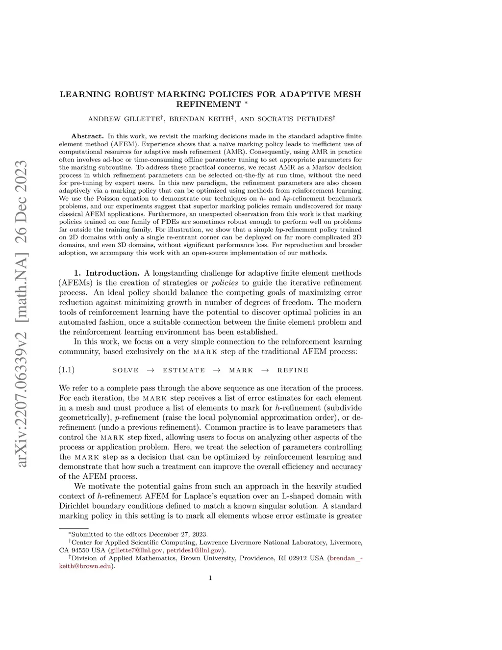 In this work, we revisit the marking decisions made in the standard adaptive finite element method (AFEM). Experience shows that a na\"{i}ve marking policy leads to inefficient use of computational resources for adaptive mesh refinement (AMR). Consequently, using AFEM in practice often involves ad-hoc or time-consuming offline parameter tuning to set appropriate parameters for the marking subroutine. To address these practical concerns, we recast AMR as a Markov decision process in which refinement parameters can be selected on-the-fly at run time, without the need for pre-tuning by expert users. In this new paradigm, the refinement parameters are also chosen adaptively via a marking policy that can be optimized using methods from reinforcement learning. We use the Poisson equation to demonstrate our techniques on - and -refinement benchmark problems, and our experiments suggest that superior marking policies remain undiscovered for many classical AFEM applications. Furthermore, an unexpected observation from this work is that marking policies trained on one family of PDEs are sometimes robust enough to perform well on problems far outside the training family. For illustration, we show that a simple -refinement policy trained on 2D domains with only a single re-entrant corner can be deployed on far more complicated 2D domains, and even 3D domains, without significant performance loss. For reproduction and broader adoption, we accompany this work with an open-source implementation of our methods.