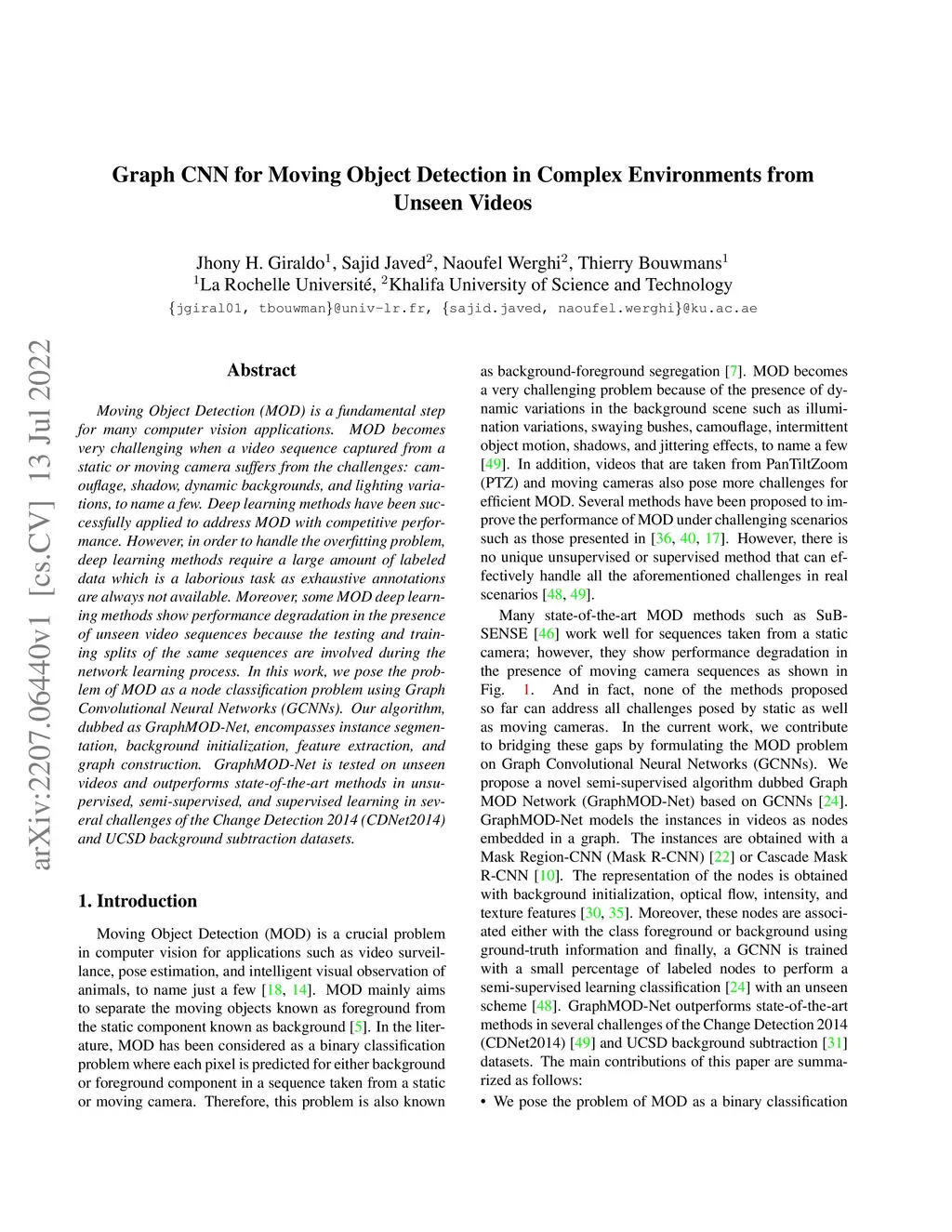 Graph CNN for Moving Object Detection in Complex Environments from