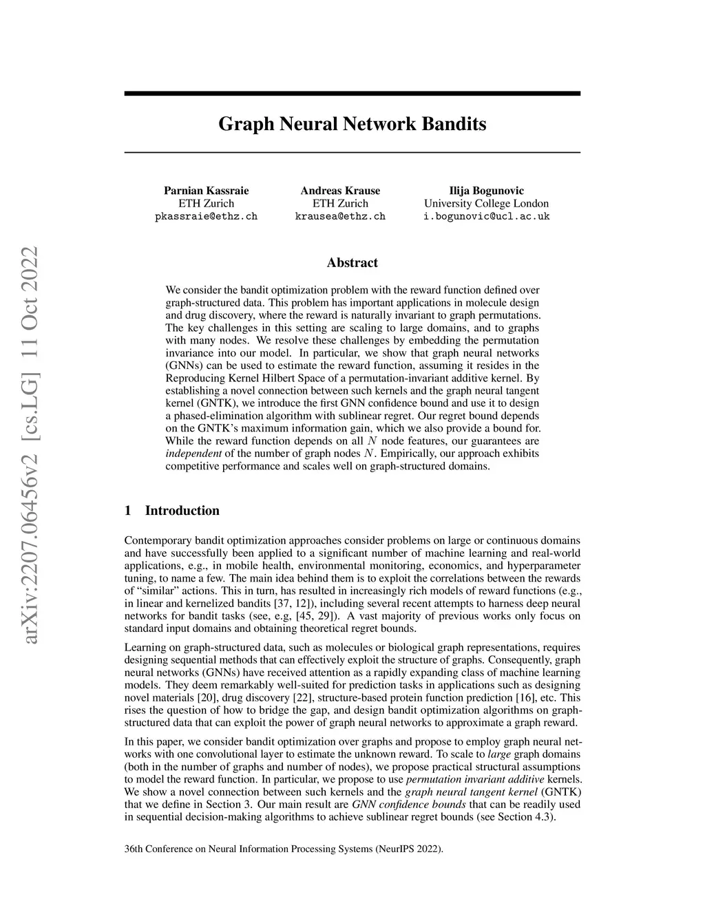 We consider the bandit optimization problem with the reward function defined over graph-structured data. This problem has important applications in molecule design and drug discovery, where the reward is naturally invariant to graph permutations. The key challenges in this setting are scaling to large domains, and to graphs with many nodes. We resolve these challenges by embedding the permutation invariance into our model. In particular, we show that graph neural networks (GNNs) can be used to estimate the reward function, assuming it resides in the Reproducing Kernel Hilbert Space of a permutation-invariant additive kernel. By establishing a novel connection between such kernels and the graph neural tangent kernel (GNTK), we introduce the first GNN confidence bound and use it to design a phased-elimination algorithm with sublinear regret. Our regret bound depends on the GNTK's maximum information gain, which we also provide a bound for. While the reward function depends on all node features, our guarantees are independent of the number of graph nodes . Empirically, our approach exhibits competitive performance and scales well on graph-structured domains.