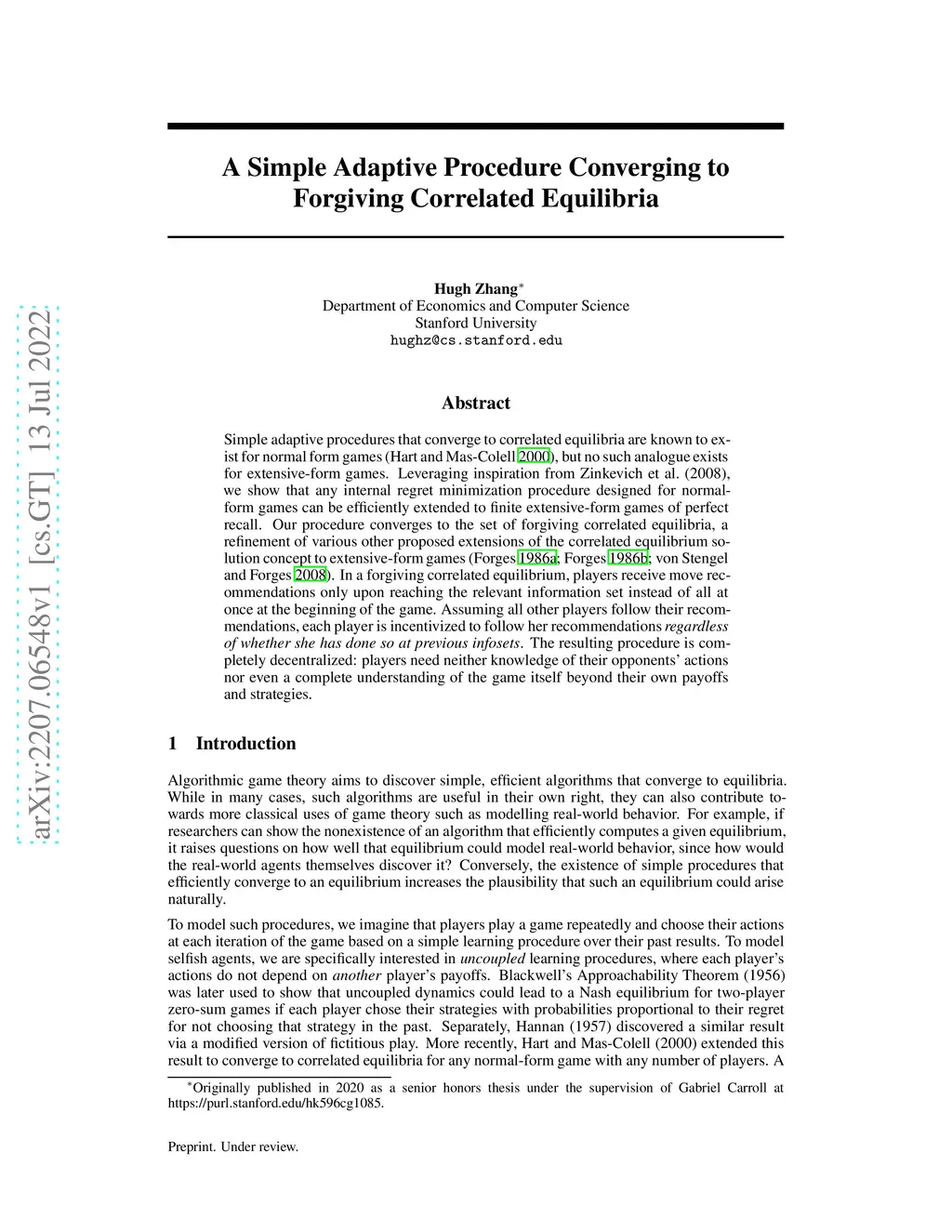 Simple adaptive procedures that converge to correlated equilibria are known to exist for normal form games (Hart and Mas-Colell 2000), but no such analogue exists for extensive-form games. Leveraging inspiration from Zinkevich et al. (2008), we show that any internal regret minimization procedure designed for normal-form games can be efficiently extended to finite extensive-form games of perfect recall. Our procedure converges to the set of forgiving correlated equilibria, a refinement of various other proposed extensions of the correlated equilibrium solution concept to extensive-form games (Forges 1986a; Forges 1986b; von Stengel and Forges 2008). In a forgiving correlated equilibrium, players receive move recommendations only upon reaching the relevant information set instead of all at once at the beginning of the game. Assuming all other players follow their recommendations, each player is incentivized to follow her recommendations regardless of whether she has done so at previous infosets. The resulting procedure is completely decentralized: players need neither knowledge of their opponents' actions nor even a complete understanding of the game itself beyond their own payoffs and strategies.