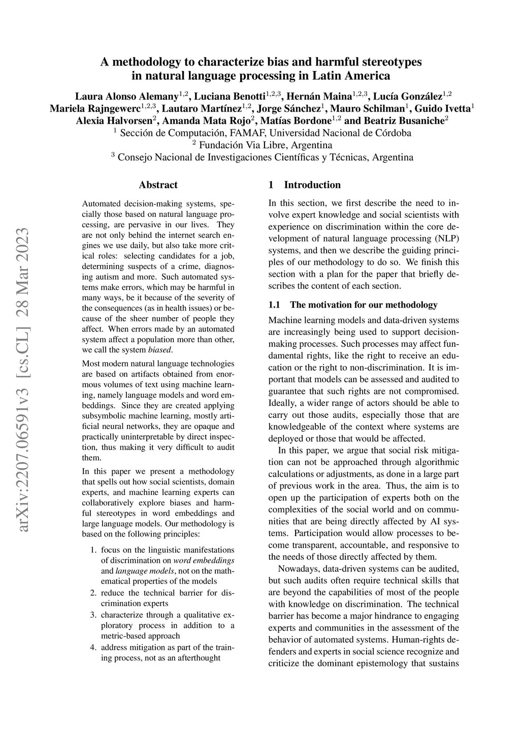 Automated decision-making systems, especially those based on natural language processing, are pervasive in our lives. They are not only behind the internet search engines we use daily, but also take more critical roles: selecting candidates for a job, determining suspects of a crime, diagnosing autism and more. Such automated systems make errors, which may be harmful in many ways, be it because of the severity of the consequences (as in health issues) or because of the sheer number of people they affect. When errors made by an automated system affect a population more than others, we call the system \textit{biased}. Most modern natural language technologies are based on artifacts obtained from enormous volumes of text using machine learning, namely language models and word embeddings. Since they are created by applying subsymbolic machine learning, mostly artificial neural networks, they are opaque and practically uninterpretable by direct inspection, thus making it very difficult to audit them. In this paper, we present a methodology that spells out how social scientists, domain experts, and machine learning experts can collaboratively explore biases and harmful stereotypes in word embeddings and large language models. Our methodology is based on the following principles: * focus on the linguistic manifestations of discrimination on word embeddings and language models, not on the mathematical properties of the models * reduce the technical barrier for discrimination experts%, be it social scientists, domain experts or other * characterize through a qualitative exploratory process in addition to a metric-based approach * address mitigation as part of the training process, not as an afterthought