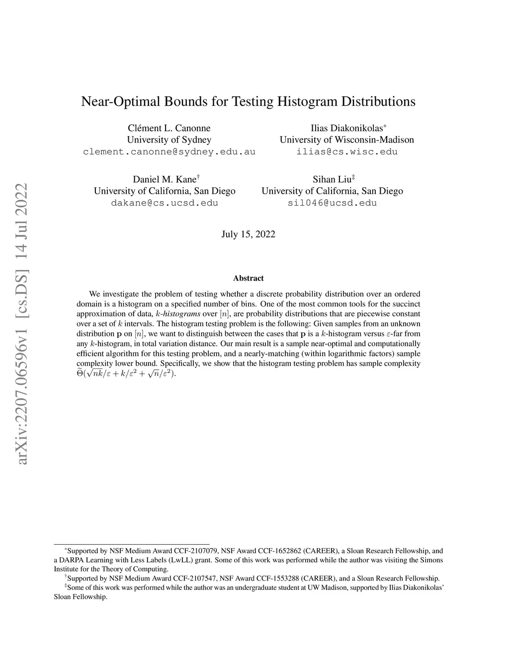We investigate the problem of testing whether a discrete probability distribution over an ordered domain is a histogram on a specified number of bins. One of the most common tools for the succinct approximation of data, -histograms over , are probability distributions that are piecewise constant over a set of intervals. The histogram testing problem is the following: Given samples from an unknown distribution on , we want to distinguish between the cases that is a -histogram versus -far from any -histogram, in total variation distance. Our main result is a sample near-optimal and computationally efficient algorithm for this testing problem, and a nearly-matching (within logarithmic factors) sample complexity lower bound. Specifically, we show that the histogram testing problem has sample complexity .