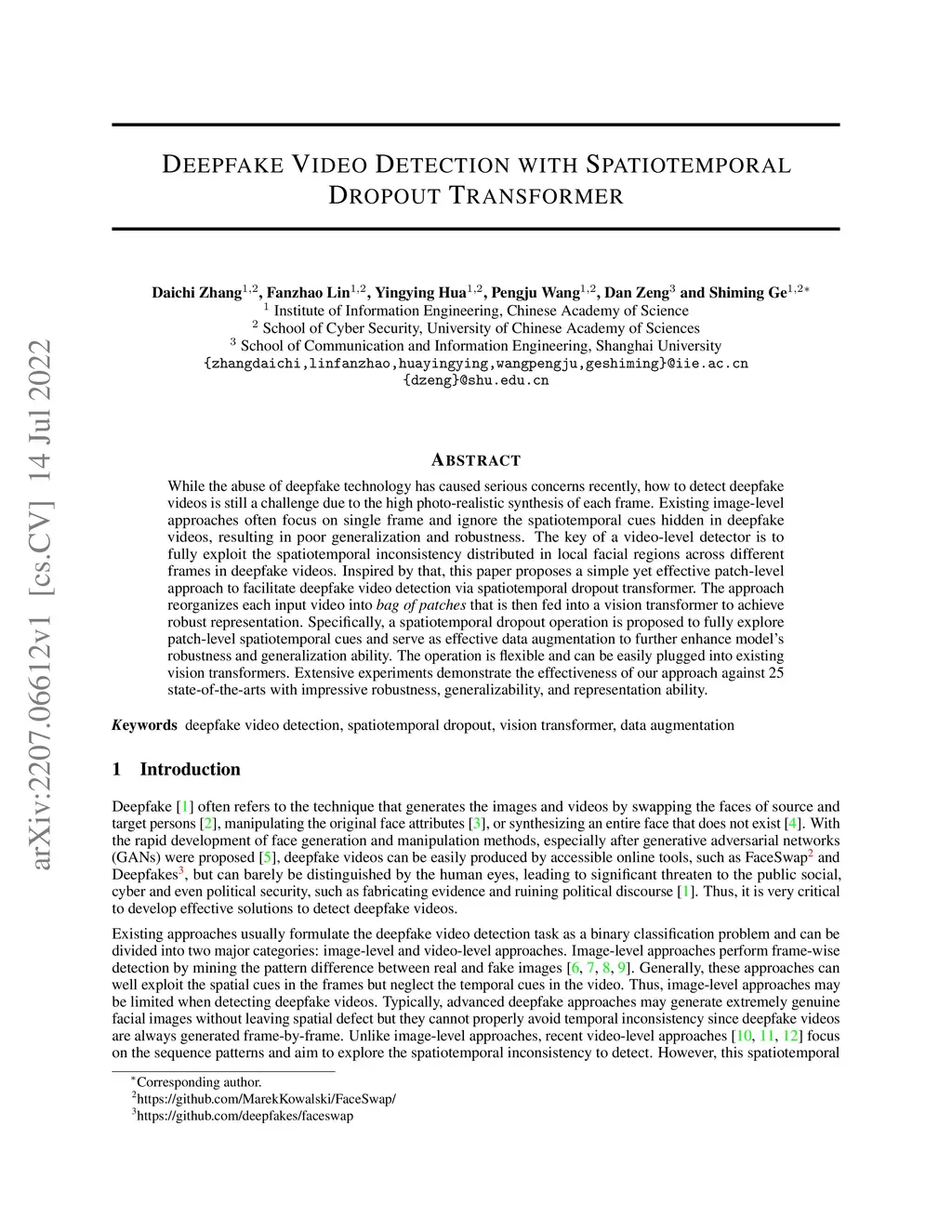Deepfake Video Detection with Spatiotemporal Dropout Transformer