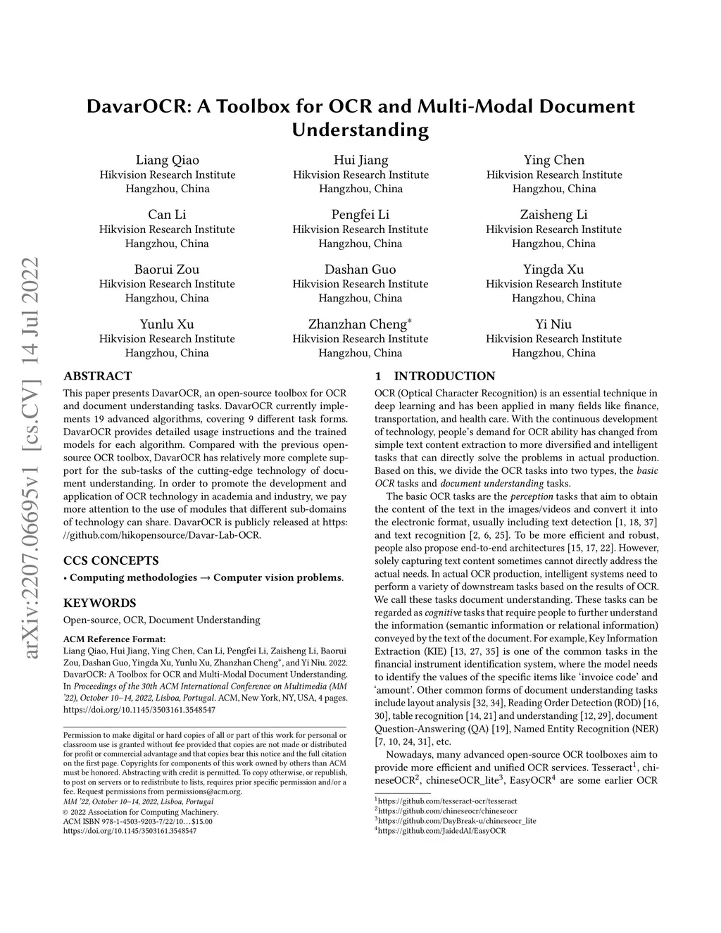 This paper presents DavarOCR, an open-source toolbox for OCR and document understanding tasks. DavarOCR currently implements 19 advanced algorithms, covering 9 different task forms. DavarOCR provides detailed usage instructions and the trained models for each algorithm. Compared with the previous opensource OCR toolbox, DavarOCR has relatively more complete support for the sub-tasks of the cutting-edge technology of document understanding. In order to promote the development and application of OCR technology in academia and industry, we pay more attention to the use of modules that different sub-domains of technology can share. DavarOCR is publicly released at https://github.com/hikopensource/Davar-Lab-OCR.