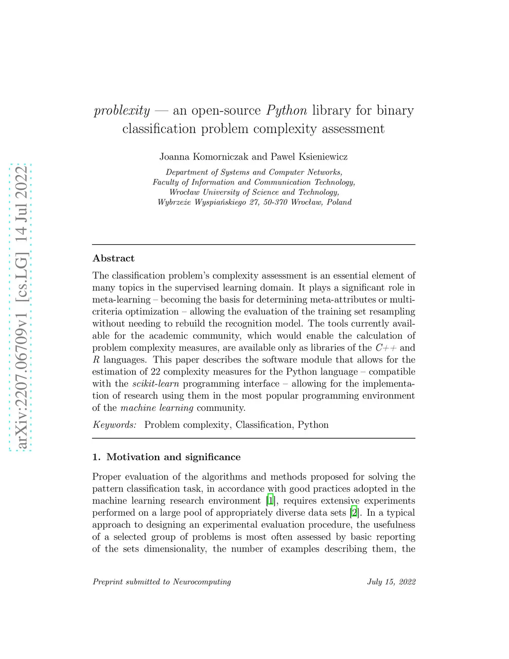 The classification problem's complexity assessment is an essential element of many topics in the supervised learning domain. It plays a significant role in meta-learning -- becoming the basis for determining meta-attributes or multi-criteria optimization -- allowing the evaluation of the training set resampling without needing to rebuild the recognition model. The tools currently available for the academic community, which would enable the calculation of problem complexity measures, are available only as libraries of the C++ and R languages. This paper describes the software module that allows for the estimation of 22 complexity measures for the Python language -- compatible with the scikit-learn programming interface -- allowing for the implementation of research using them in the most popular programming environment of the machine learning community.