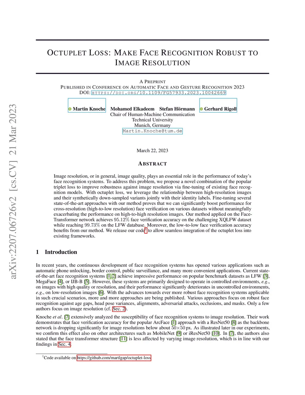 Octuplet Loss: Make Face Recognition Robust to Image Resolution