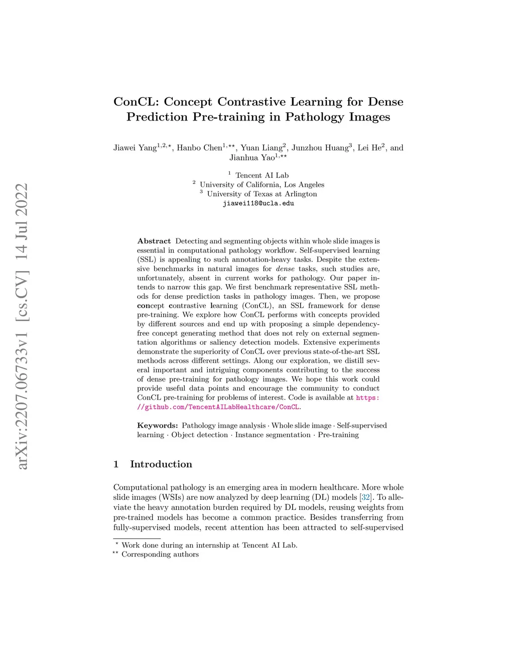 Detectingandsegmentingobjectswithinwholeslideimagesis essential in computational pathology workflow. Self-supervised learning (SSL) is appealing to such annotation-heavy tasks. Despite the extensive benchmarks in natural images for dense tasks, such studies are, unfortunately, absent in current works for pathology. Our paper intends to narrow this gap. We first benchmark representative SSL methods for dense prediction tasks in pathology images. Then, we propose concept contrastive learning (ConCL), an SSL framework for dense pre-training. We explore how ConCL performs with concepts provided by different sources and end up with proposing a simple dependency-free concept generating method that does not rely on external segmentation algorithms or saliency detection models. Extensive experiments demonstrate the superiority of ConCL over previous state-of-the-art SSL methods across different settings. Along our exploration, we distll several important and intriguing components contributing to the success of dense pre-training for pathology images. We hope this work could provide useful data points and encourage the community to conduct ConCL pre-training for problems of interest. Code is available.