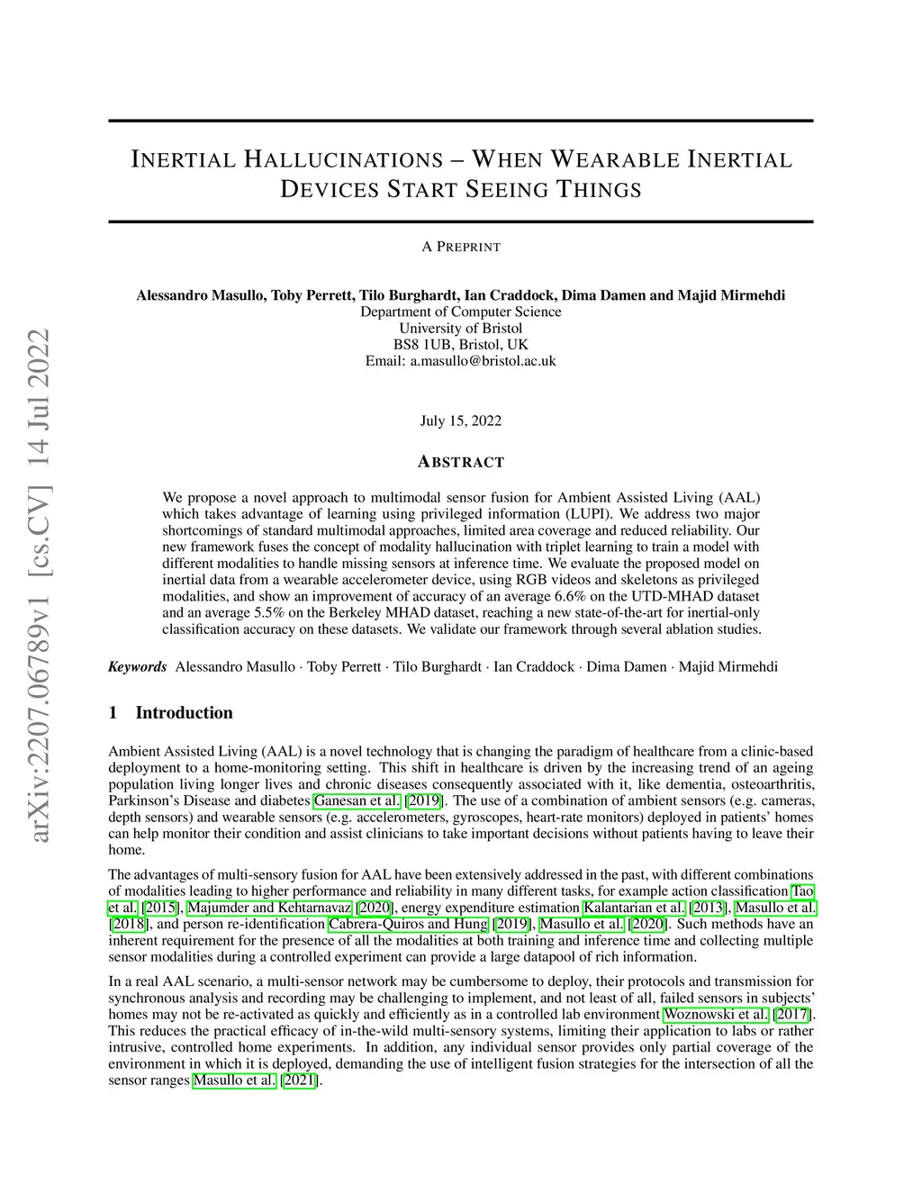 We propose a novel approach to multimodal sensor fusion for Ambient Assisted Living (AAL) which takes advantage of learning using privileged information (LUPI). We address two major shortcomings of standard multimodal approaches, limited area coverage and reduced reliability. Our new framework fuses the concept of modality hallucination with triplet learning to train a model with different modalities to handle missing sensors at inference time. We evaluate the proposed model on inertial data from a wearable accelerometer device, using RGB videos and skeletons as privileged modalities, and show an improvement of accuracy of an average 6.6% on the UTD-MHAD dataset and an average 5.5% on the Berkeley MHAD dataset, reaching a new state-of-the-art for inertial-only classification accuracy on these datasets. We validate our framework through several ablation studies.