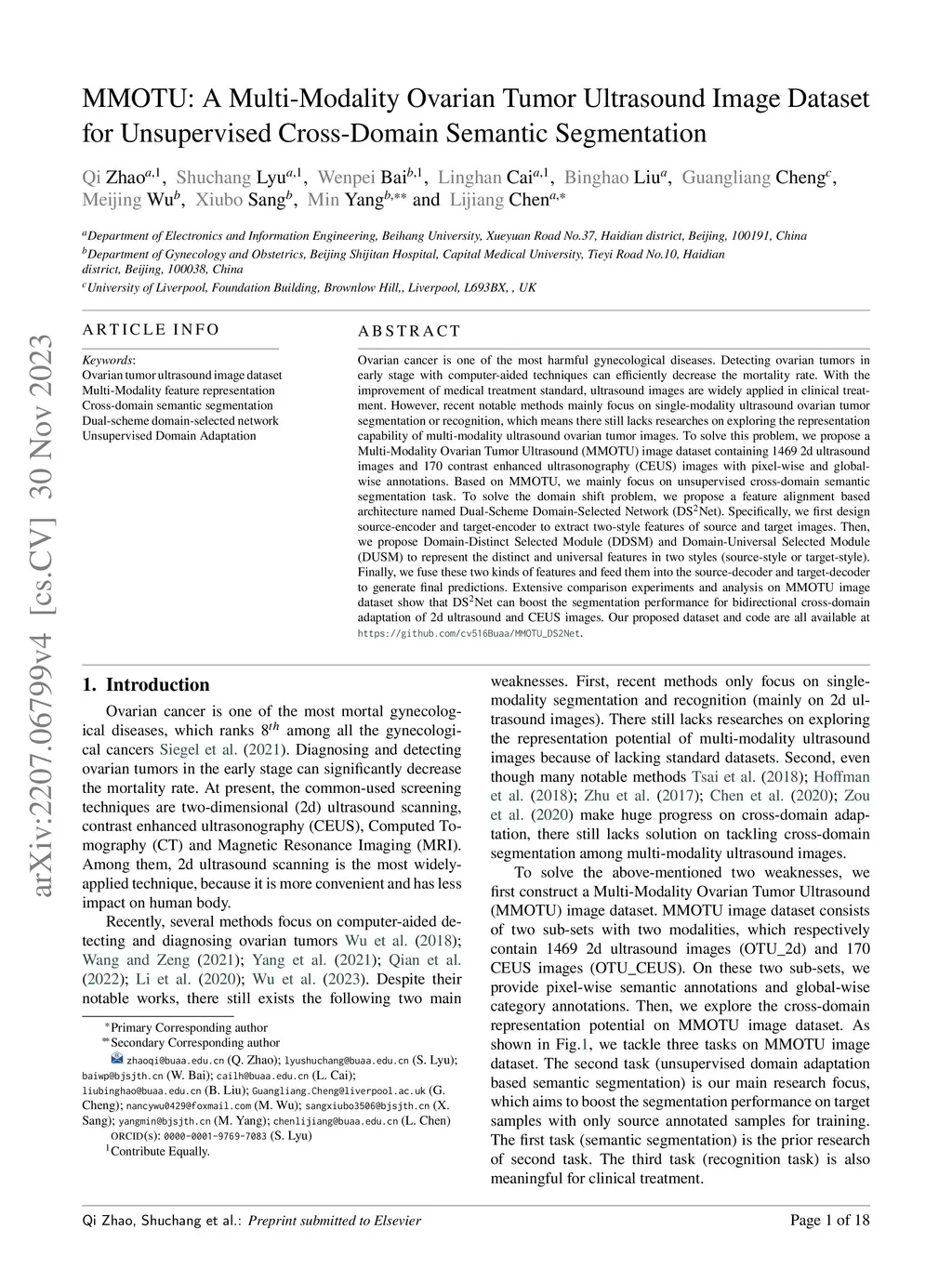 Ovarian cancer is one of the most harmful gynecological diseases. Detecting ovarian tumors in early stage with computer-aided techniques can efficiently decrease the mortality rate. With the improvement of medical treatment standard, ultrasound images are widely applied in clinical treatment. However, recent notable methods mainly focus on single-modality ultrasound ovarian tumor segmentation or recognition, which means there still lacks researches on exploring the representation capability of multi-modality ultrasound ovarian tumor images. To solve this problem, we propose a Multi-Modality Ovarian Tumor Ultrasound (MMOTU) image dataset containing 1469 2d ultrasound images and 170 contrast enhanced ultrasonography (CEUS) images with pixel-wise and global-wise annotations. Based on MMOTU, we mainly focus on unsupervised cross-domain semantic segmentation task. To solve the domain shift problem, we propose a feature alignment based architecture named Dual-Scheme Domain-Selected Network (DS2Net). Specifically, we first design source-encoder and target-encoder to extract two-style features of source and target images. Then, we propose Domain-Distinct Selected Module (DDSM) and Domain-Universal Selected Module (DUSM) to extract the distinct and universal features in two styles (source-style or target-style). Finally, we fuse these two kinds of features and feed them into the source-decoder and target-decoder to generate final predictions. Extensive comparison experiments and analysis on MMOTU image dataset show that DS2Net can boost the segmentation performance for bidirectional cross-domain adaptation of 2d ultrasound images and CEUS images. Our proposed dataset and code are all available at https://github.com/cv516Buaa/MMOTU_DS2Net.