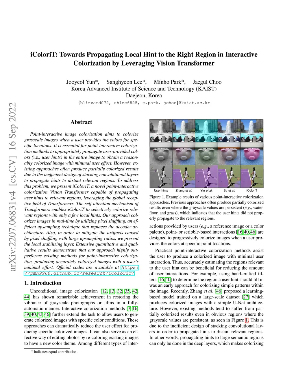 iColoriT: Towards Propagating Local Hint to the Right Region in