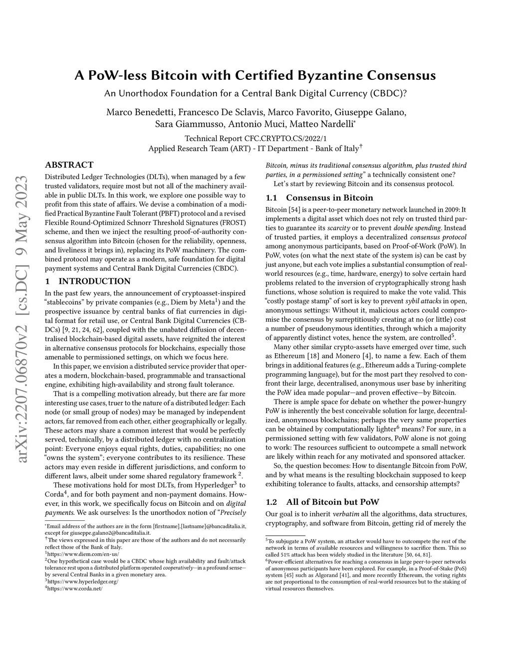 Distributed Ledger Technologies (DLTs), when managed by a few trusted validators, require most but not all of the machinery available in public DLTs. In this work, we explore one possible way to profit from this state of affairs. We devise a combination of a modified Practical Byzantine Fault Tolerant (PBFT) protocol and a revised Flexible Round-Optimized Schnorr Threshold Signatures (FROST) scheme, and then we inject the resulting proof-of-authority consensus algorithm into Bitcoin (chosen for the reliability, openness, and liveliness it brings in), replacing its PoW machinery. The combined protocol may operate as a modern, safe foundation for digital payment systems and Central Bank Digital Currencies (CBDC).
