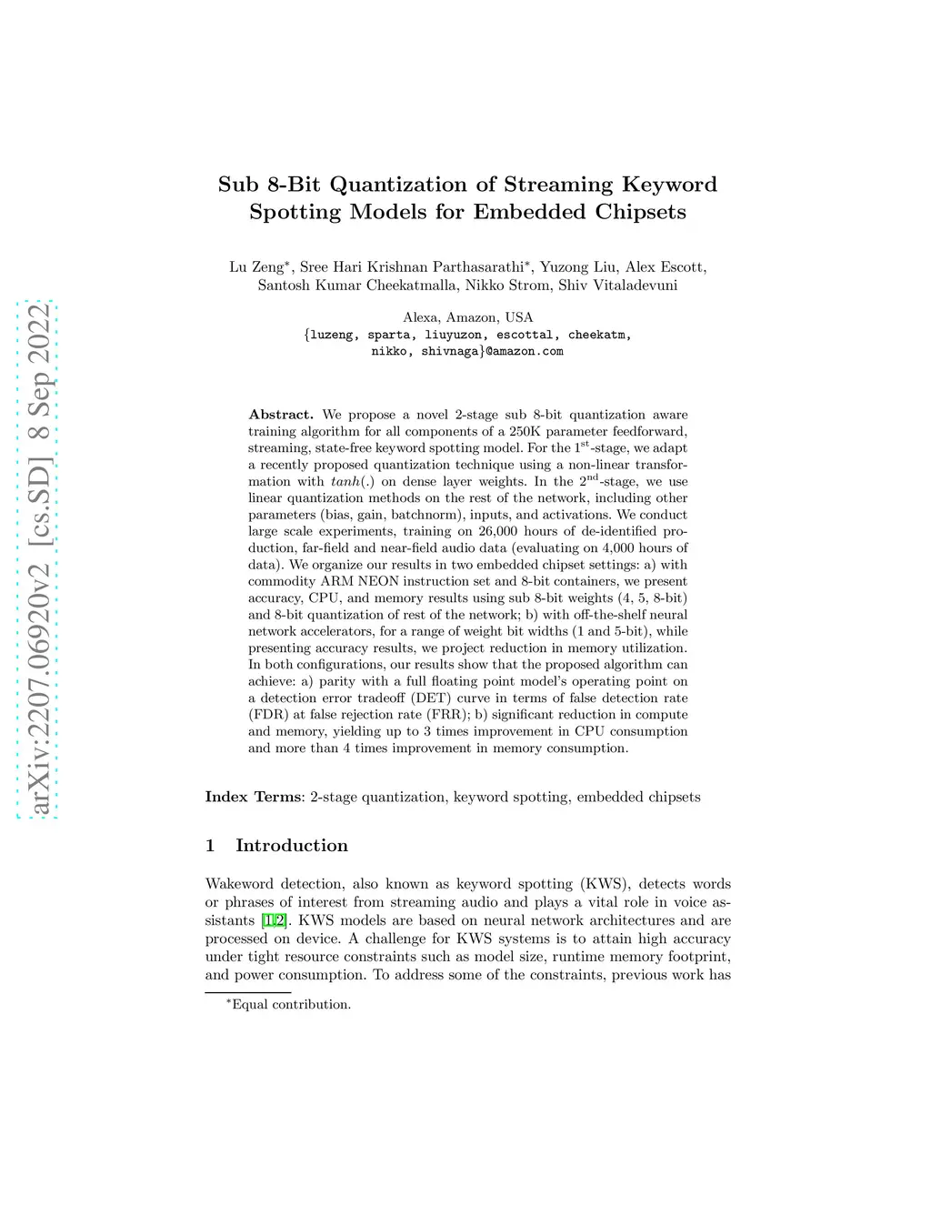 We propose a novel 2-stage sub 8-bit quantization aware training algorithm for all components of a 250K parameter feedforward, streaming, state-free keyword spotting model. For the 1st-stage, we adapt a recently proposed quantization technique using a non-linear transformation with tanh(.) on dense layer weights. In the 2nd-stage, we use linear quantization methods on the rest of the network, including other parameters (bias, gain, batchnorm), inputs, and activations. We conduct large scale experiments, training on 26,000 hours of de-identified production, far-field and near-field audio data (evaluating on 4,000 hours of data). We organize our results in two embedded chipset settings: a) with commodity ARM NEON instruction set and 8-bit containers, we present accuracy, CPU, and memory results using sub 8-bit weights (4, 5, 8-bit) and 8-bit quantization of rest of the network; b) with off-the-shelf neural network accelerators, for a range of weight bit widths (1 and 5-bit), while presenting accuracy results, we project reduction in memory utilization. In both configurations, our results show that the proposed algorithm can achieve: a) parity with a full floating point model's operating point on a detection error tradeoff (DET) curve in terms of false detection rate (FDR) at false rejection rate (FRR); b) significant reduction in compute and memory, yielding up to 3 times improvement in CPU consumption and more than 4 times improvement in memory consumption.