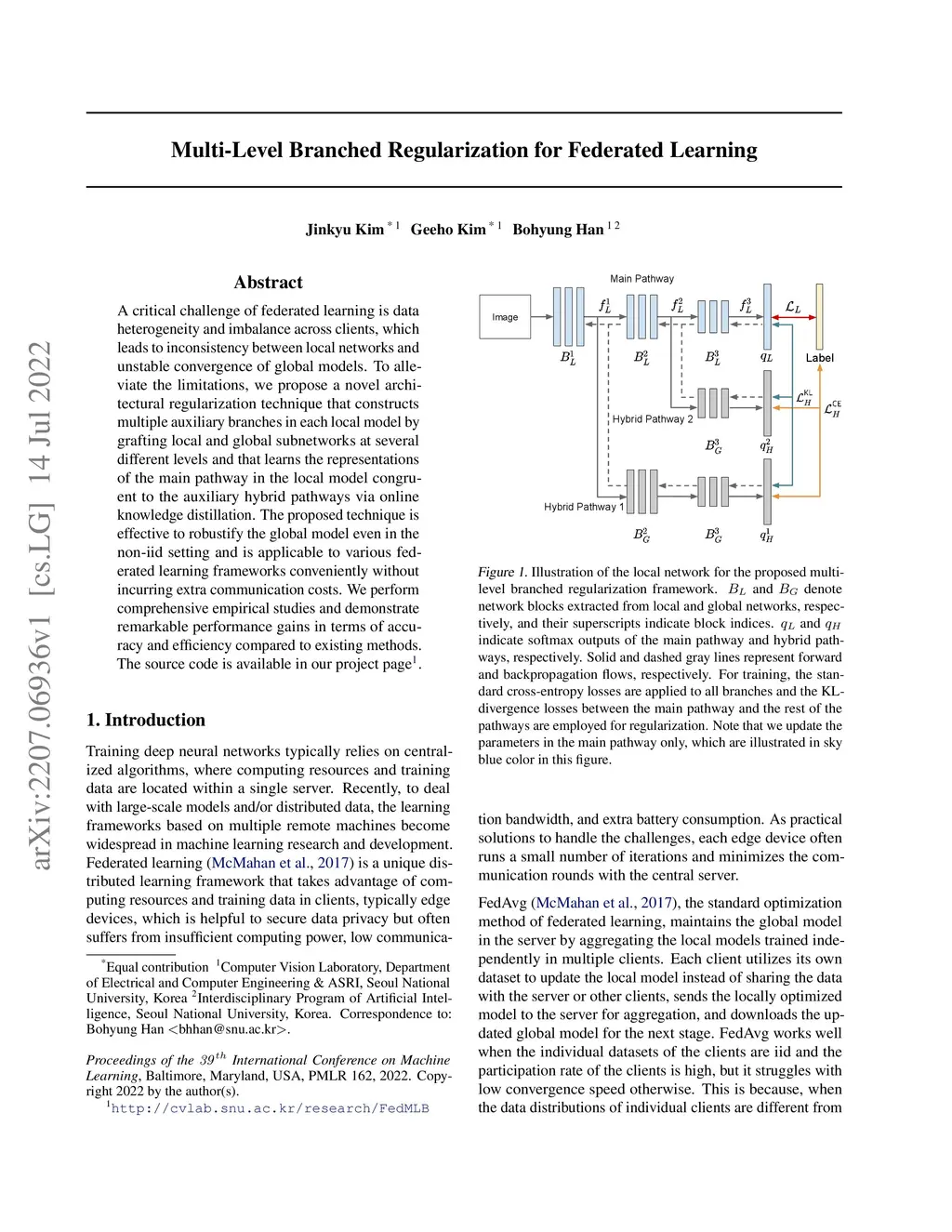 A critical challenge of federated learning is data heterogeneity and imbalance across clients, which leads to inconsistency between local networks and unstable convergence of global models. To alleviate the limitations, we propose a novel architectural regularization technique that constructs multiple auxiliary branches in each local model by grafting local and global subnetworks at several different levels and that learns the representations of the main pathway in the local model congruent to the auxiliary hybrid pathways via online knowledge distillation. The proposed technique is effective to robustify the global model even in the non-iid setting and is applicable to various federated learning frameworks conveniently without incurring extra communication costs. We perform comprehensive empirical studies and demonstrate remarkable performance gains in terms of accuracy and efficiency compared to existing methods. The source code is available at our project page.