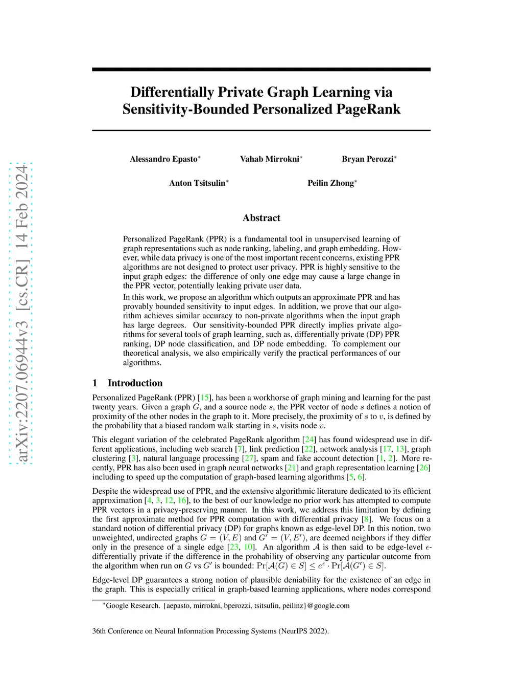 Personalized PageRank (PPR) is a fundamental tool in unsupervised learning of graph representations such as node ranking, labeling, and graph embedding. However, while data privacy is one of the most important recent concerns, existing PPR algorithms are not designed to protect user privacy. PPR is highly sensitive to the input graph edges: the difference of only one edge may cause a big change in the PPR vector, potentially leaking private user data. In this work, we propose an algorithm which outputs an approximate PPR and has provably bounded sensitivity to input edges. In addition, we prove that our algorithm achieves similar accuracy to non-private algorithms when the input graph has large degrees. Our sensitivity-bounded PPR directly implies private algorithms for several tools of graph learning, such as, differentially private (DP) PPR ranking, DP node classification, and DP node embedding. To complement our theoretical analysis, we also empirically verify the practical performances of our algorithms.