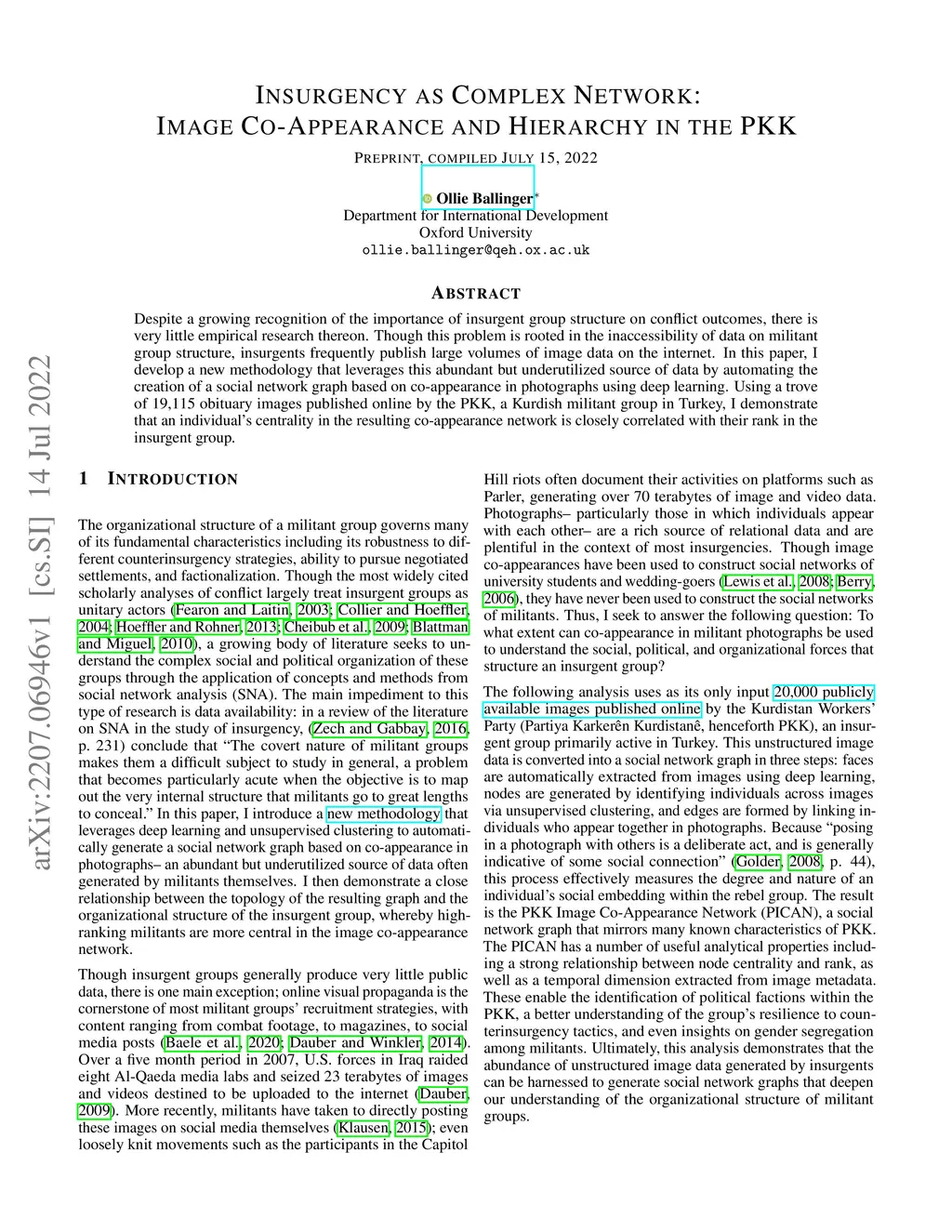 Despite a growing recognition of the importance of insurgent group structure on conflict outcomes, there is very little empirical research thereon. Though this problem is rooted in the inaccessibility of data on militant group structure, insurgents frequently publish large volumes of image data on the internet. In this paper, I develop a new methodology that leverages this abundant but underutilized source of data by automating the creation of a social network graph based on co-appearance in photographs using deep learning. Using a trove of 19,115 obituary images published online by the PKK, a Kurdish militant group in Turkey, I demonstrate that an individual's centrality in the resulting co-appearance network is closely correlated with their rank in the insurgent group.