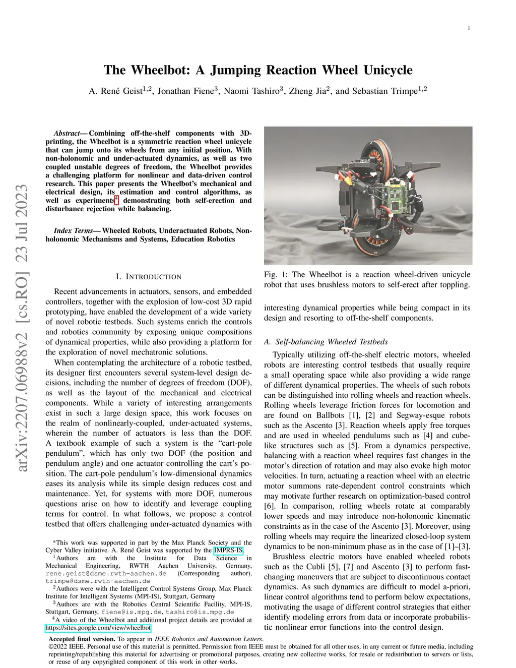 Combining off-the-shelf components with 3D-printing, the Wheelbot is a symmetric reaction wheel unicycle that can jump onto its wheels from any initial position. With non-holonomic and under-actuated dynamics, as well as two coupled unstable degrees of freedom, the Wheelbot provides a challenging platform for nonlinear and data-driven control research. This paper presents the Wheelbot's mechanical and electrical design, its estimation and control algorithms, as well as experiments demonstrating both self-erection and disturbance rejection while balancing.