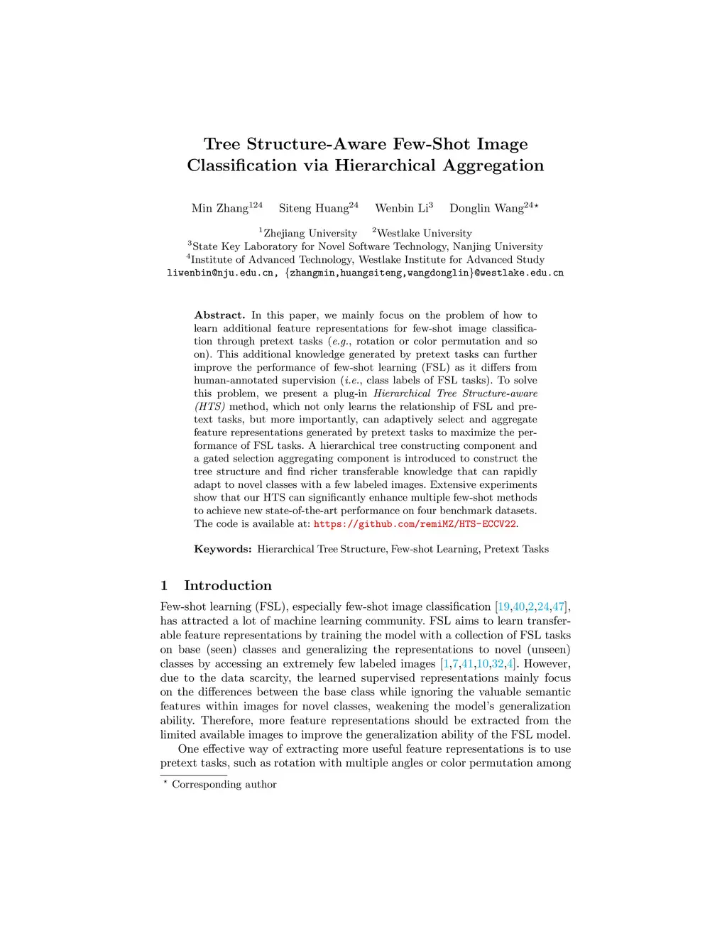 In this paper, we mainly focus on the problem of how to learn additional feature representations for few-shot image classification through pretext tasks (e.g., rotation or color permutation and so on). This additional knowledge generated by pretext tasks can further improve the performance of few-shot learning (FSL) as it differs from human-annotated supervision (i.e., class labels of FSL tasks). To solve this problem, we present a plug-in Hierarchical Tree Structure-aware (HTS) method, which not only learns the relationship of FSL and pretext tasks, but more importantly, can adaptively select and aggregate feature representations generated by pretext tasks to maximize the performance of FSL tasks. A hierarchical tree constructing component and a gated selection aggregating component is introduced to construct the tree structure and find richer transferable knowledge that can rapidly adapt to novel classes with a few labeled images. Extensive experiments show that our HTS can significantly enhance multiple few-shot methods to achieve new state-of-the-art performance on four benchmark datasets. The code is available at: https://github.com/remiMZ/HTS-ECCV22.