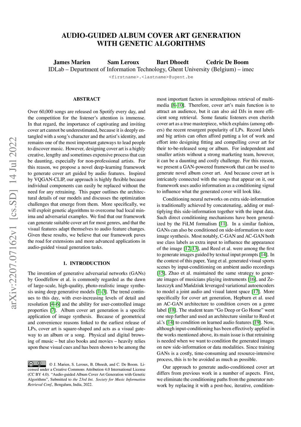 Over 60,000 songs are released on Spotify every day, and the competition for the listener's attention is immense. In that regard, the importance of captivating and inviting cover art cannot be underestimated, because it is deeply entangled with a song's character and the artist's identity, and remains one of the most important gateways to lead people to discover music. However, designing cover art is a highly creative, lengthy and sometimes expensive process that can be daunting, especially for non-professional artists. For this reason, we propose a novel deep-learning framework to generate cover art guided by audio features. Inspired by VQGAN-CLIP, our approach is highly flexible because individual components can easily be replaced without the need for any retraining. This paper outlines the architectural details of our models and discusses the optimization challenges that emerge from them. More specifically, we will exploit genetic algorithms to overcome bad local minima and adversarial examples. We find that our framework can generate suitable cover art for most genres, and that the visual features adapt themselves to audio feature changes. Given these results, we believe that our framework paves the road for extensions and more advanced applications in audio-guided visual generation tasks.