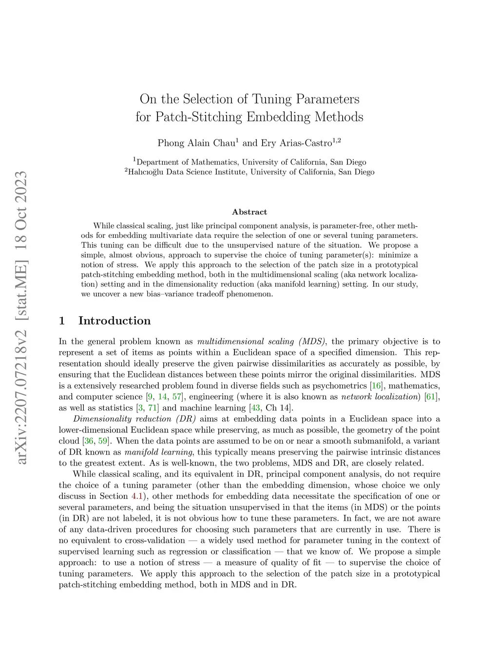 While classical scaling, just like principal component analysis, is parameter-free, other methods for embedding multivariate data require the selection of one or several tuning parameters. This tuning can be difficult due to the unsupervised nature of the situation. We propose a simple, almost obvious, approach to supervise the choice of tuning parameter(s): minimize a notion of stress. We apply this approach to the selection of the patch size in a prototypical patch-stitching embedding method, both in the multidimensional scaling (aka network localization) setting and in the dimensionality reduction (aka manifold learning) setting. In our study, we uncover a new bias--variance tradeoff phenomenon.