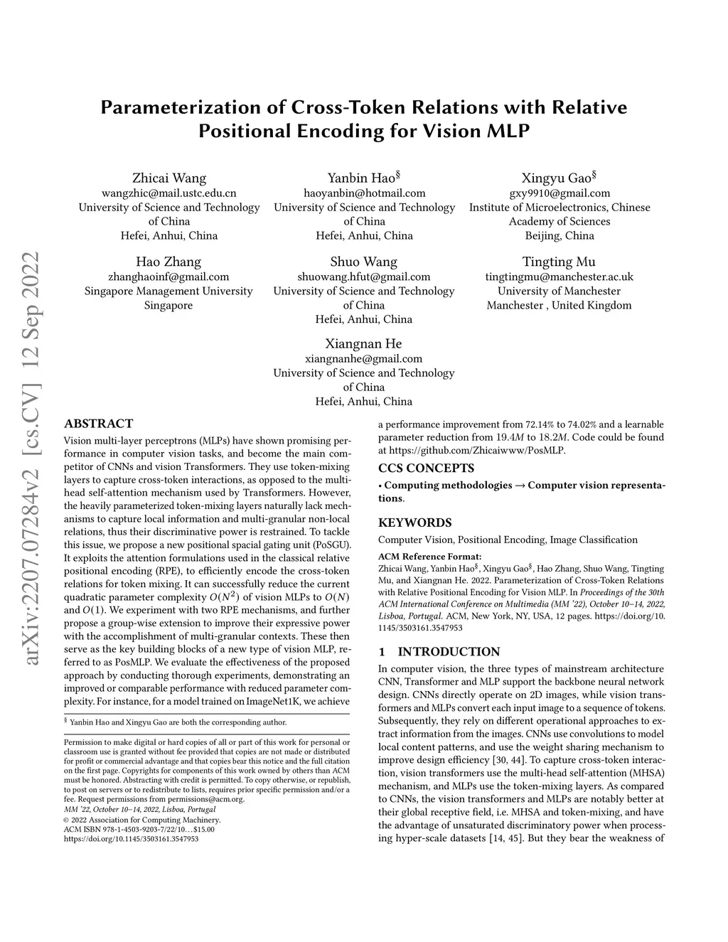 Vision multi-layer perceptrons (MLPs) have shown promising performance in computer vision tasks, and become the main competitor of CNNs and vision Transformers. They use token-mixing layers to capture cross-token interactions, as opposed to the multi-head self-attention mechanism used by Transformers. However, the heavily parameterized token-mixing layers naturally lack mechanisms to capture local information and multi-granular non-local relations, thus their discriminative power is restrained. To tackle this issue, we propose a new positional spacial gating unit (PoSGU). It exploits the attention formulations used in the classical relative positional encoding (RPE), to efficiently encode the cross-token relations for token mixing. It can successfully reduce the current quadratic parameter complexity of vision MLPs to and . We experiment with two RPE mechanisms, and further propose a group-wise extension to improve their expressive power with the accomplishment of multi-granular contexts. These then serve as the key building blocks of a new type of vision MLP, referred to as PosMLP. We evaluate the effectiveness of the proposed approach by conducting thorough experiments, demonstrating an improved or comparable performance with reduced parameter complexity. For instance, for a model trained on ImageNet1K, we achieve a performance improvement from 72.14\% to 74.02\% and a learnable parameter reduction from to . Code could be found at \href{https://github.com/Zhicaiwww/PosMLP}{https://github.com/Zhicaiwww/PosMLP}.