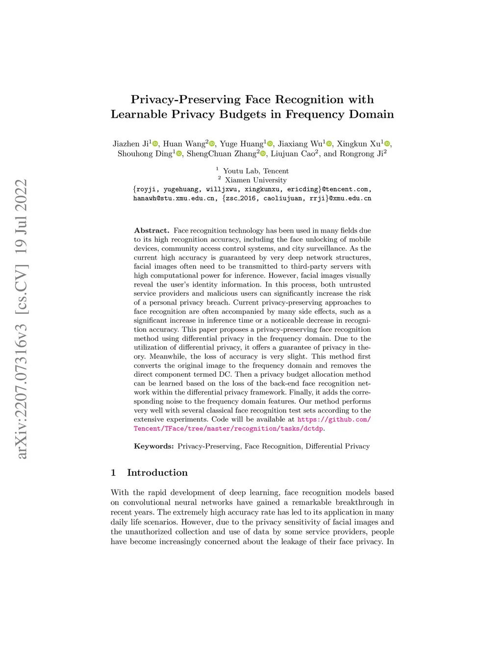 Face recognition technology has been used in many fields due to its high recognition accuracy, including the face unlocking of mobile devices, community access control systems, and city surveillance. As the current high accuracy is guaranteed by very deep network structures, facial images often need to be transmitted to third-party servers with high computational power for inference. However, facial images visually reveal the user's identity information. In this process, both untrusted service providers and malicious users can significantly increase the risk of a personal privacy breach. Current privacy-preserving approaches to face recognition are often accompanied by many side effects, such as a significant increase in inference time or a noticeable decrease in recognition accuracy. This paper proposes a privacy-preserving face recognition method using differential privacy in the frequency domain. Due to the utilization of differential privacy, it offers a guarantee of privacy in theory. Meanwhile, the loss of accuracy is very slight. This method first converts the original image to the frequency domain and removes the direct component termed DC. Then a privacy budget allocation method can be learned based on the loss of the back-end face recognition network within the differential privacy framework. Finally, it adds the corresponding noise to the frequency domain features. Our method performs very well with several classical face recognition test sets according to the extensive experiments.