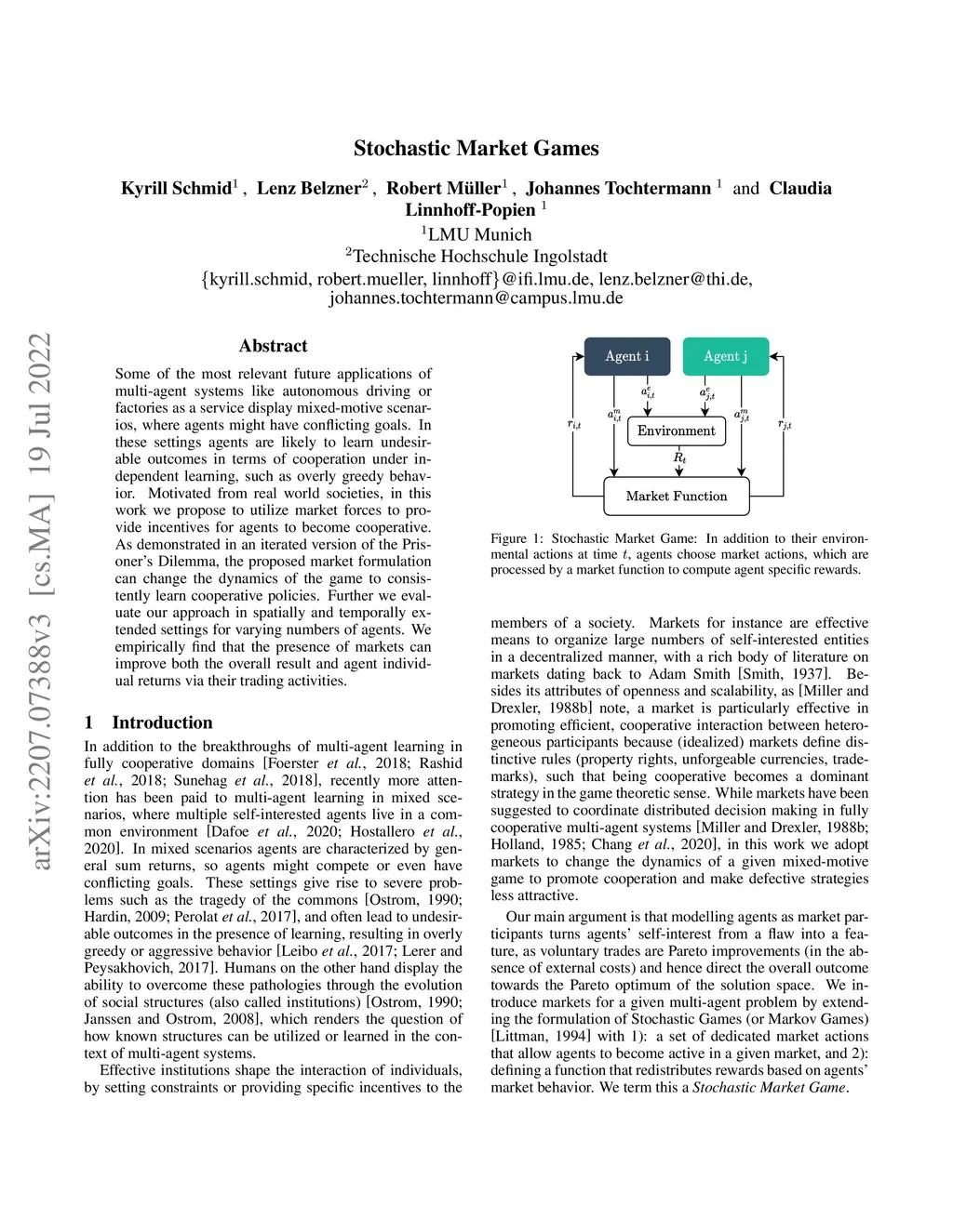 Some of the most relevant future applications of multi-agent systems like autonomous driving or factories as a service display mixed-motive scenarios, where agents might have conflicting goals. In these settings agents are likely to learn undesirable outcomes in terms of cooperation under independent learning, such as overly greedy behavior. Motivated from real world societies, in this work we propose to utilize market forces to provide incentives for agents to become cooperative. As demonstrated in an iterated version of the Prisoner's Dilemma, the proposed market formulation can change the dynamics of the game to consistently learn cooperative policies. Further we evaluate our approach in spatially and temporally extended settings for varying numbers of agents. We empirically find that the presence of markets can improve both the overall result and agent individual returns via their trading activities.