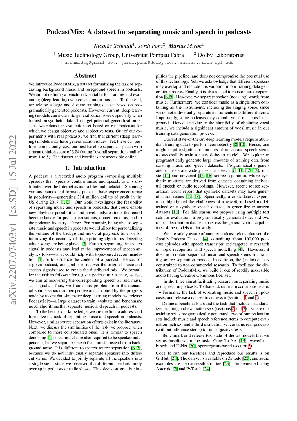 We introduce PodcastMix, a dataset formalizing the task of separating background music and foreground speech in podcasts. We aim at defining a benchmark suitable for training and evaluating (deep learning) source separation models. To that end, we release a large and diverse training dataset based on programatically generated podcasts. However, current (deep learning) models can incur into generalization issues, specially when trained on synthetic data. To target potential generalization issues, we release an evaluation set based on real podcasts for which we design objective and subjective tests. Out of our experiments with real podcasts, we find that current (deep learning) models may have generalization issues. Yet, these can perform competently, e.g., our best baseline separates speech with a mean opinion score of 3.84 (rating "overall separation quality" from 1 to 5). The dataset and baselines are accessible online.