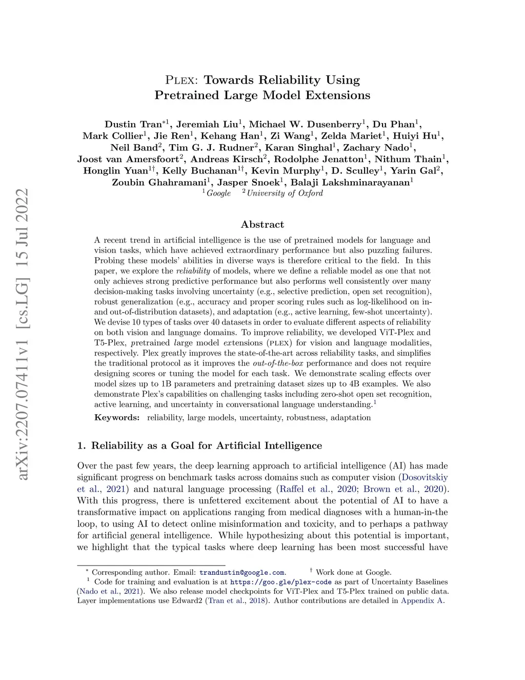 A recent trend in artificial intelligence is the use of pretrained models for language and vision tasks, which have achieved extraordinary performance but also puzzling failures. Probing these models' abilities in diverse ways is therefore critical to the field. In this paper, we explore the reliability of models, where we define a reliable model as one that not only achieves strong predictive performance but also performs well consistently over many decision-making tasks involving uncertainty (e.g., selective prediction, open set recognition), robust generalization (e.g., accuracy and proper scoring rules such as log-likelihood on in- and out-of-distribution datasets), and adaptation (e.g., active learning, few-shot uncertainty). We devise 10 types of tasks over 40 datasets in order to evaluate different aspects of reliability on both vision and language domains. To improve reliability, we developed ViT-Plex and T5-Plex, pretrained large model extensions for vision and language modalities, respectively. Plex greatly improves the state-of-the-art across reliability tasks, and simplifies the traditional protocol as it improves the out-of-the-box performance and does not require designing scores or tuning the model for each task. We demonstrate scaling effects over model sizes up to 1B parameters and pretraining dataset sizes up to 4B examples. We also demonstrate Plex's capabilities on challenging tasks including zero-shot open set recognition, active learning, and uncertainty in conversational language understanding.