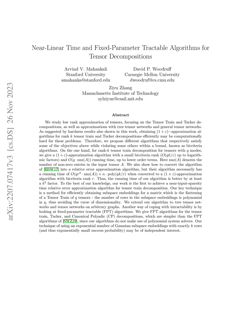 Near-Linear Time and Fixed-Parameter Tractable Algorithms for Tensor