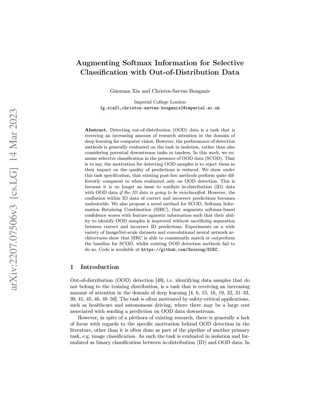 Detecting out-of-distribution (OOD) data is a task that is receiving an increasing amount of research attention in the domain of deep learning for computer vision. However, the performance of detection methods is generally evaluated on the task in isolation, rather than also considering potential downstream tasks in tandem. In this work, we examine selective classification in the presence of OOD data (SCOD). That is to say, the motivation for detecting OOD samples is to reject them so their impact on the quality of predictions is reduced. We show under this task specification, that existing post-hoc methods perform quite differently compared to when evaluated only on OOD detection. This is because it is no longer an issue to conflate in-distribution (ID) data with OOD data if the ID data is going to be misclassified. However, the conflation within ID data of correct and incorrect predictions becomes undesirable. We also propose a novel method for SCOD, Softmax Information Retaining Combination (SIRC), that augments softmax-based confidence scores with feature-agnostic information such that their ability to identify OOD samples is improved without sacrificing separation between correct and incorrect ID predictions. Experiments on a wide variety of ImageNet-scale datasets and convolutional neural network architectures show that SIRC is able to consistently match or outperform the baseline for SCOD, whilst existing OOD detection methods fail to do so.